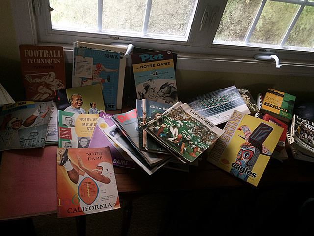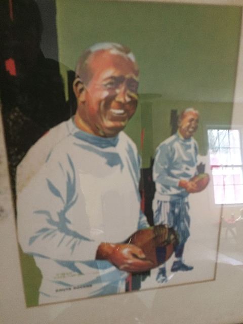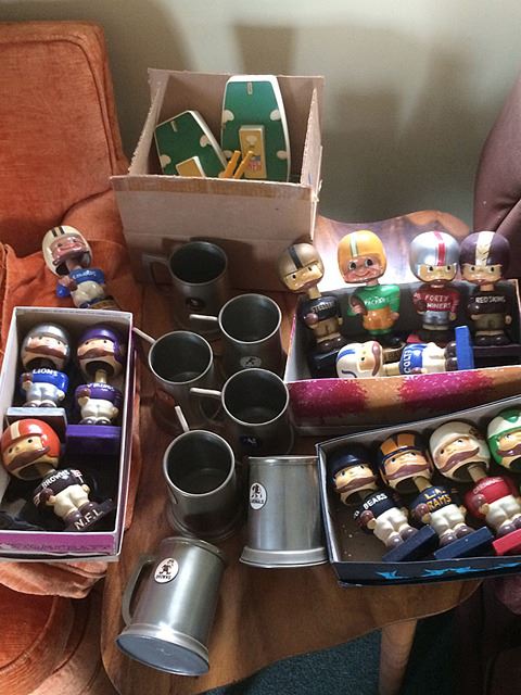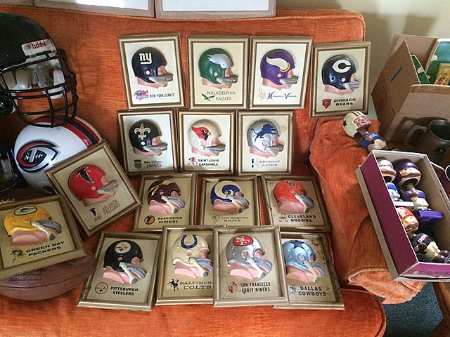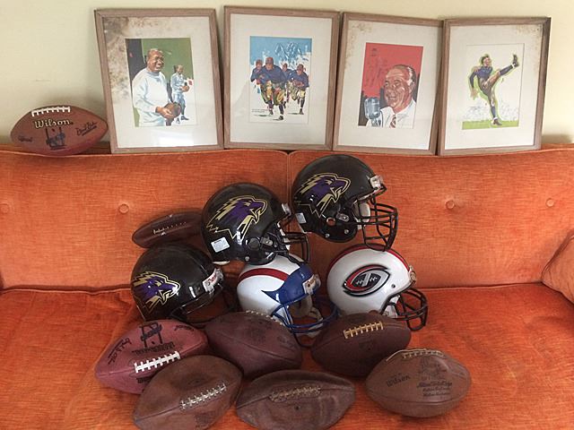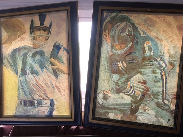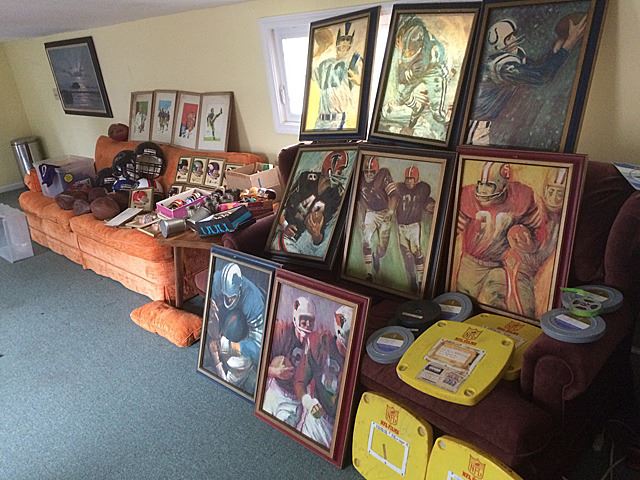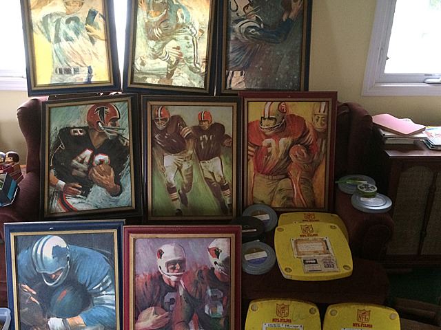 Fantastic collection from the estate of Larry Kuharich, who was an American football coach who was most recently the offensive coordinator of the Arena Football League's Columbus Destroyers. He was the son of former Notre Dame Fighting Irish and Philadelphia Eagles head football coach Joe Kuharich and the brother of former New Orleans Saints General Manager Bill Kuharich. This collection includes helmets, game footballs, NFL paintings by Dave Boss, NFL illustrations, all framed, bobbleheads (Bobble head dolls are composition, not plastic), steins, game reels, plaques, jerseys, game programs, books, and more! This is a rare and exiting opportunity to own an historic collection of football memorabilia from the estate of Larry Kuharich. You will not find items like these all in one collection on the marketplace!