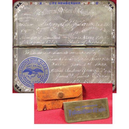 Lifetime Membership Card for the Fraternal Order of Eagles Virginia City, Nevada. Dated 1909 in original silver case. Excellent condition. 3 3/4 X 1 3/4 inches closed.