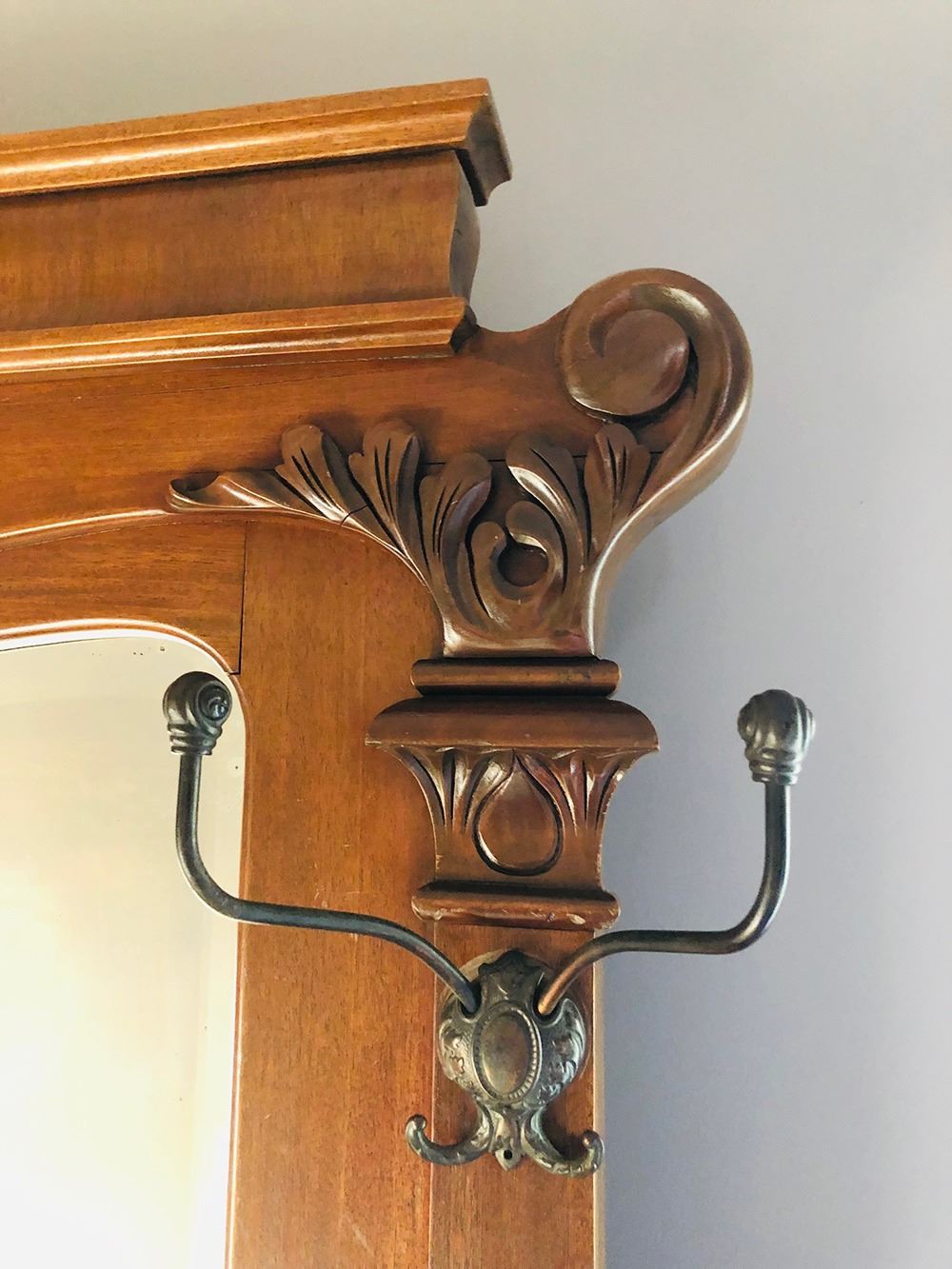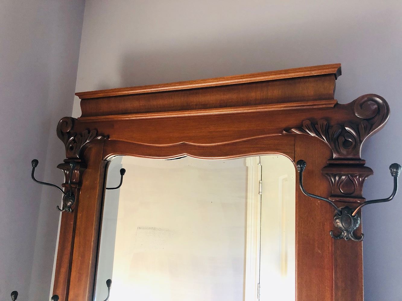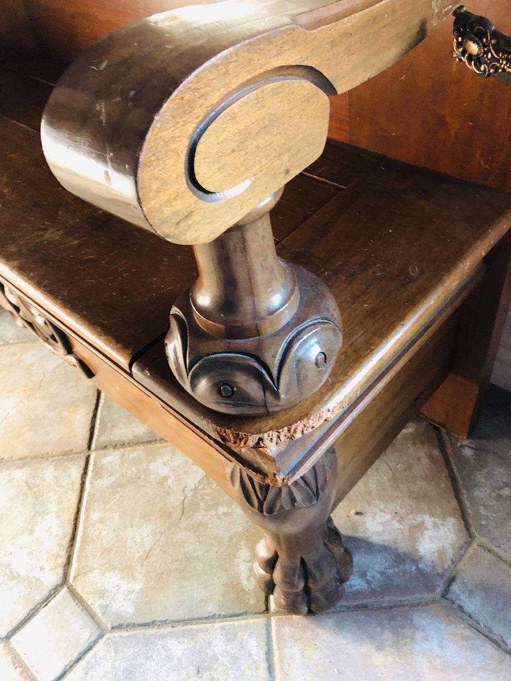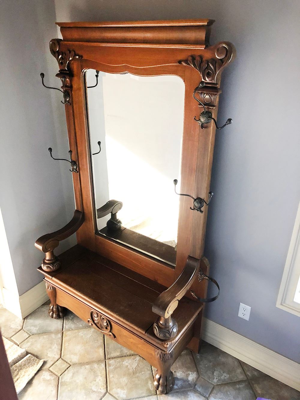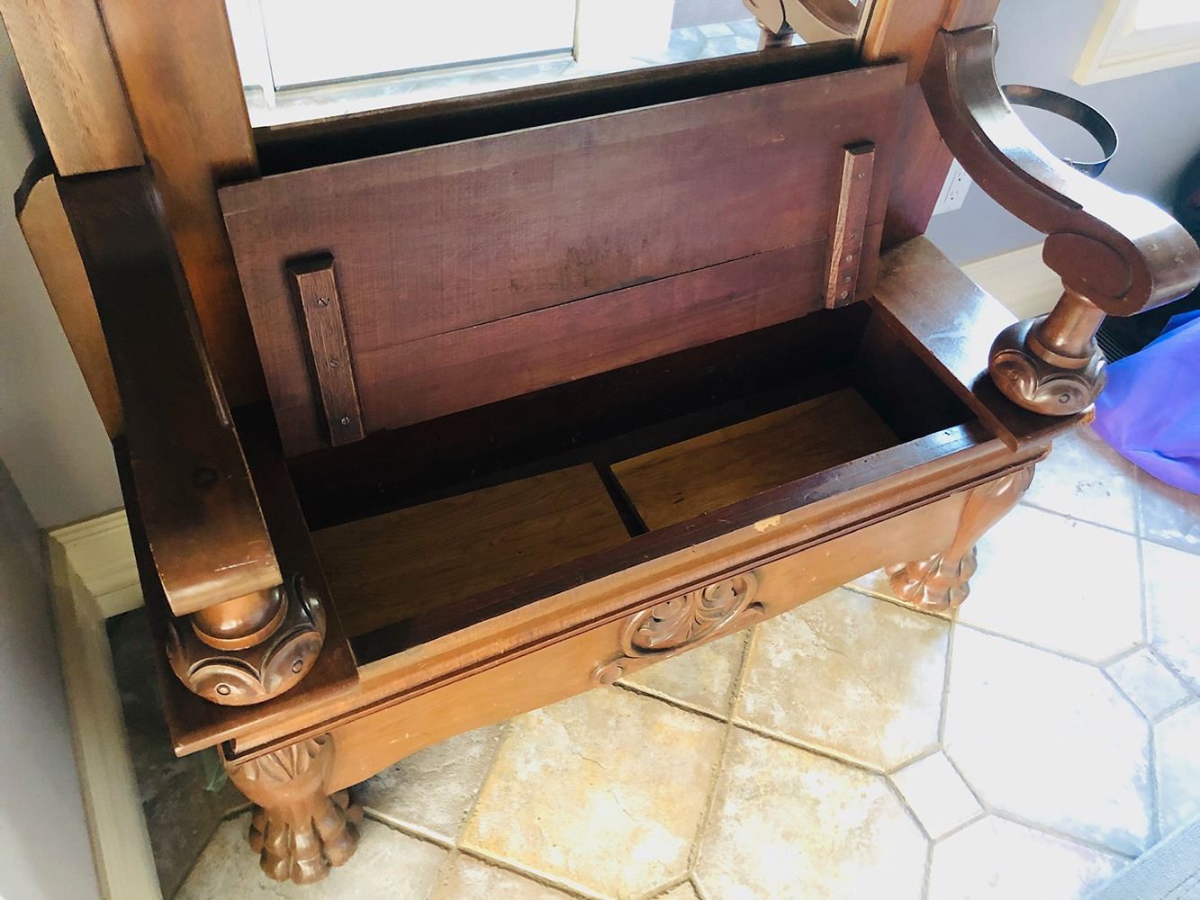 Lift Seat Hall Tree, Possibly by RJ Horner, has huge claw feet, lift seat, carving underneath the seat, large arms, all original hooks. One little spot has some minor age wear. Measures approx. 48.5 inches wide x 18.5 inches deep x 83 inches tall.