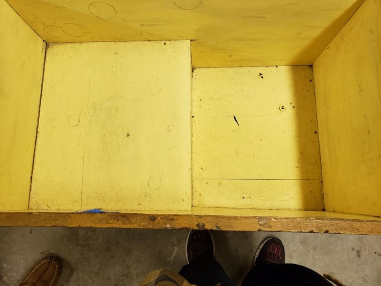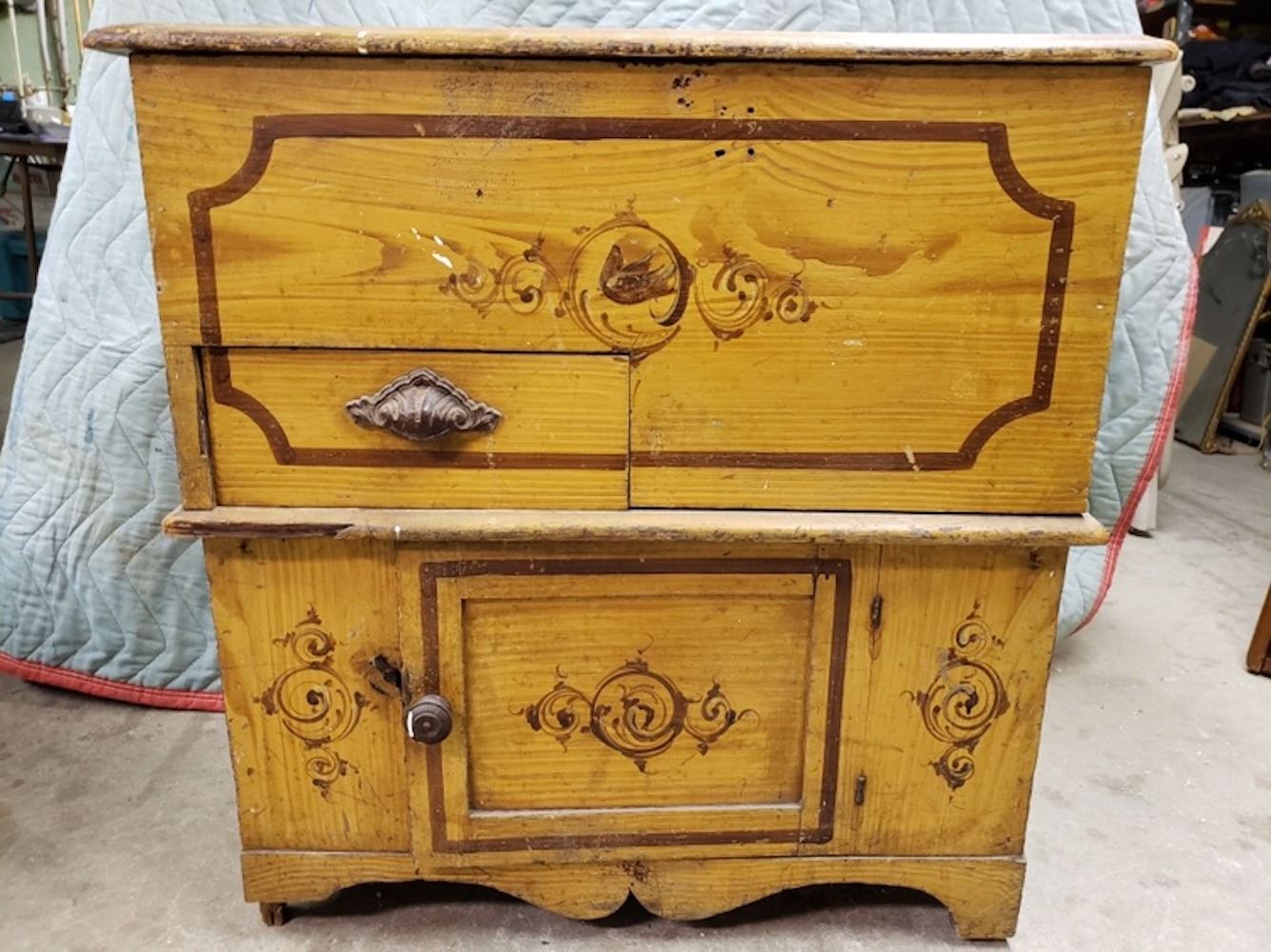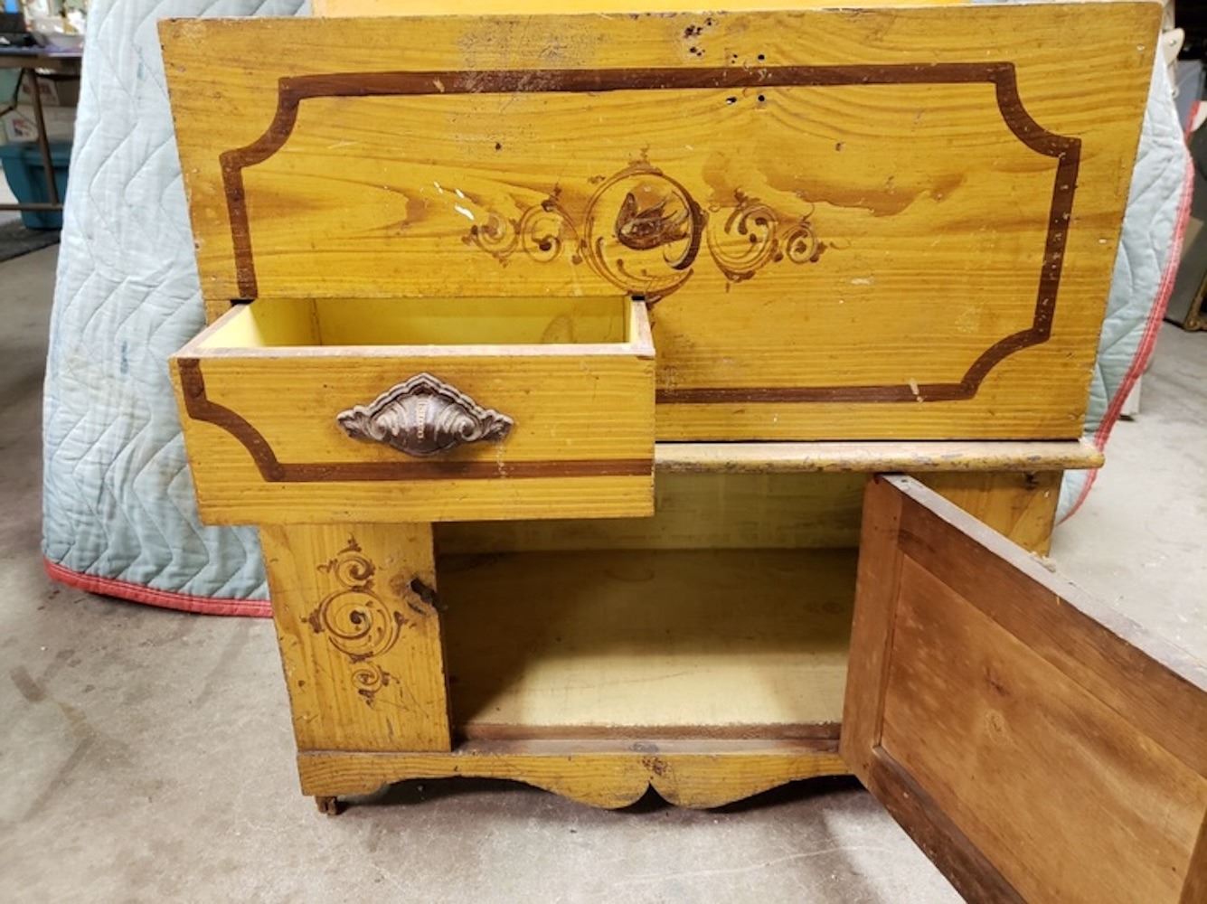 Lift top commode / wash stand, all stenciled, lift top with drawer and bottom 1 door cabinet.