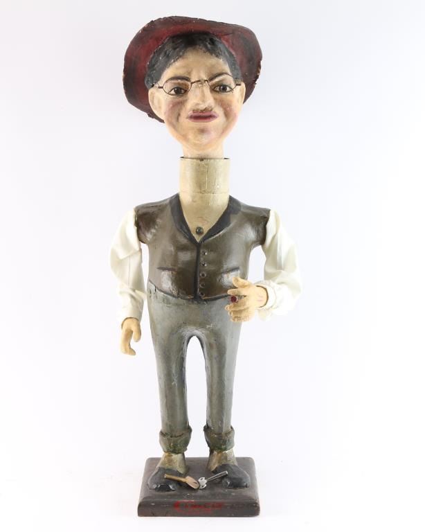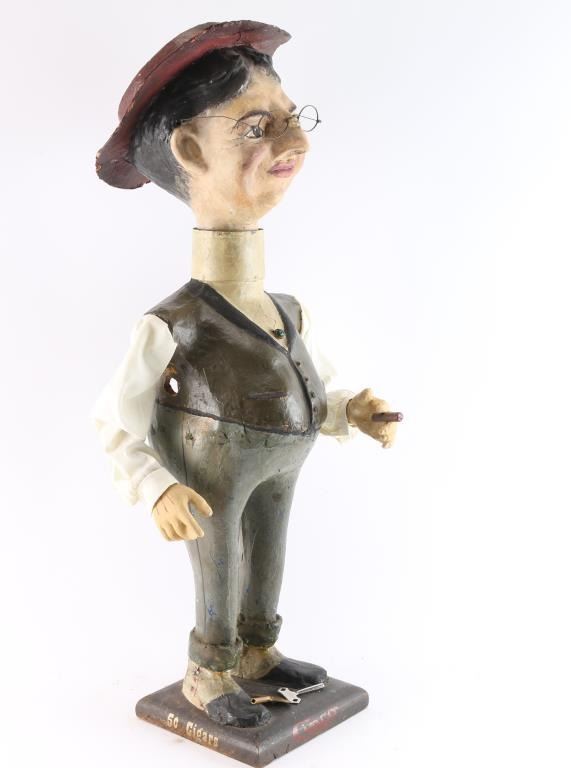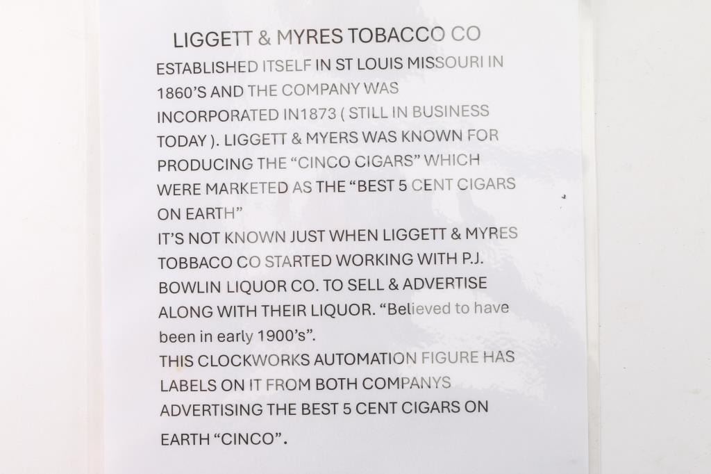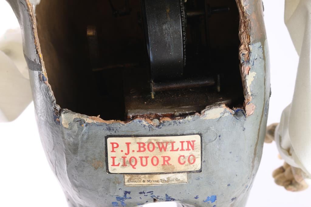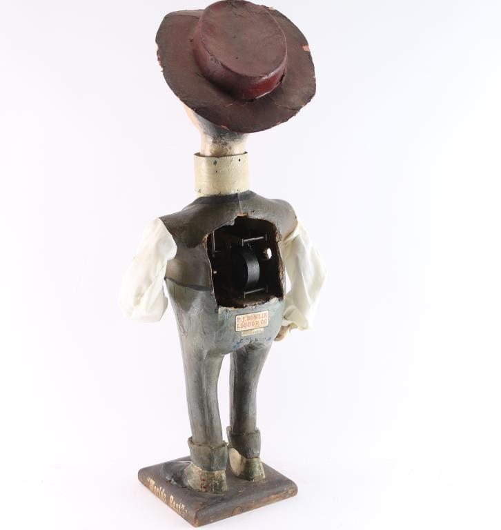 Used as trade stimulator and advertiser. Approximately 29" tall and base is marked "Cinco - World's Best". Circa turn of the century to about 1915. P. J. Brown Liquor Co. label on back. Painted composite and wood in figure of clerk with cigar that is amusing and attracts attention from movement. Winding clock type mechanism. Good condition with minor losses, aging, and imperfections. American advertising automatons for tobacco are rare.