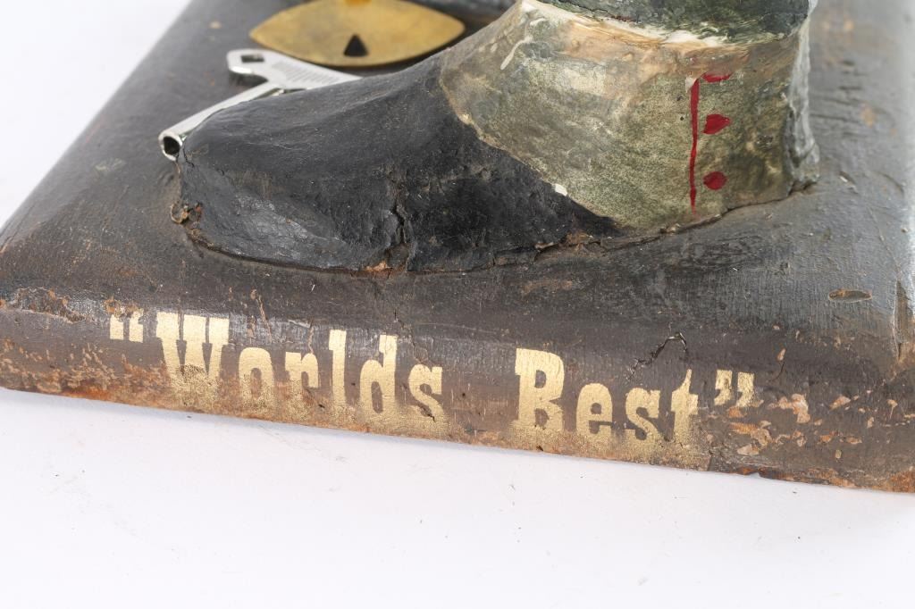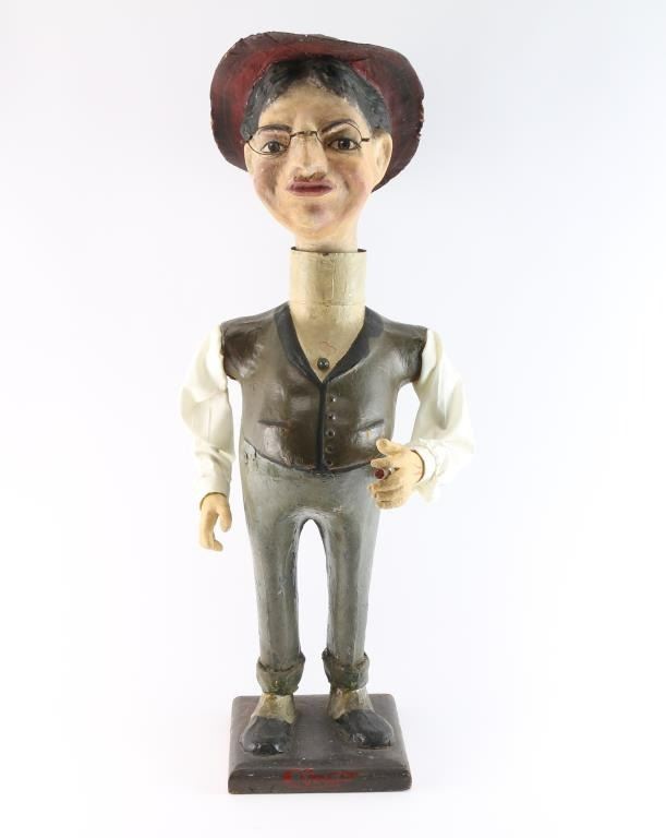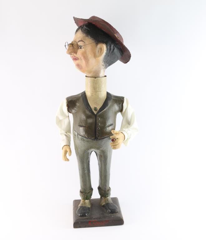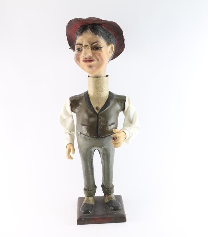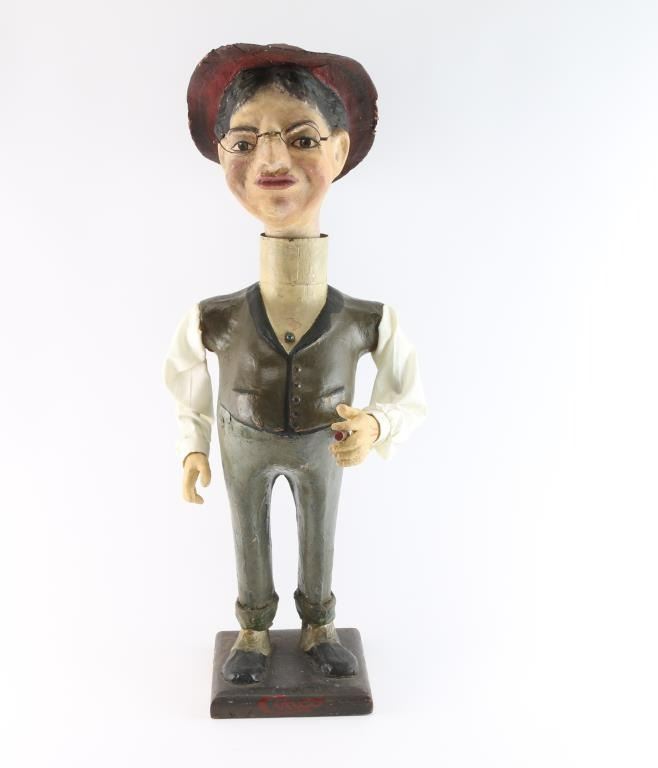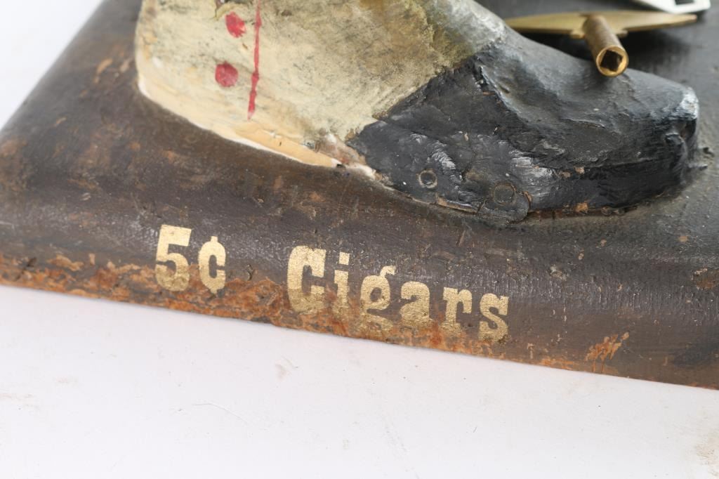 Used as trade stimulator and advertiser. Approximately 29" tall and base is marked "Cinco - World's Best". Circa turn of the century to about 1915. P. J. Brown Liquor Co. label on back. Painted composite and wood in figure of clerk with cigar that is amusing and attracts attention from movement. Winding clock type mechanism. Good condition with minor losses, aging, and imperfections. American advertising automatons for tobacco are rare.