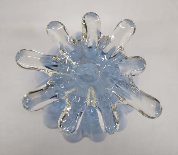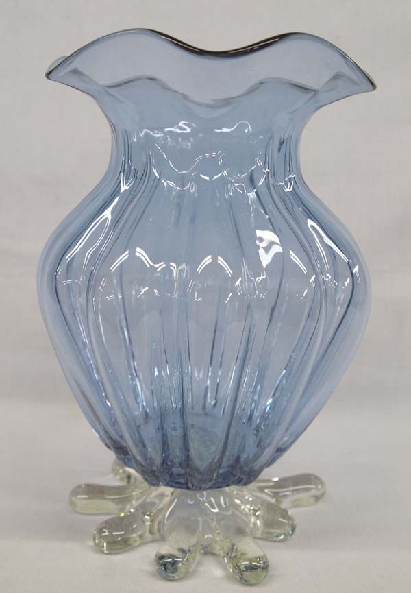 Light Amethyst Ruffled Art Glass Footed Vase, measures 6'' x 9'', beautiful light blue vase and clear abstract designed foot