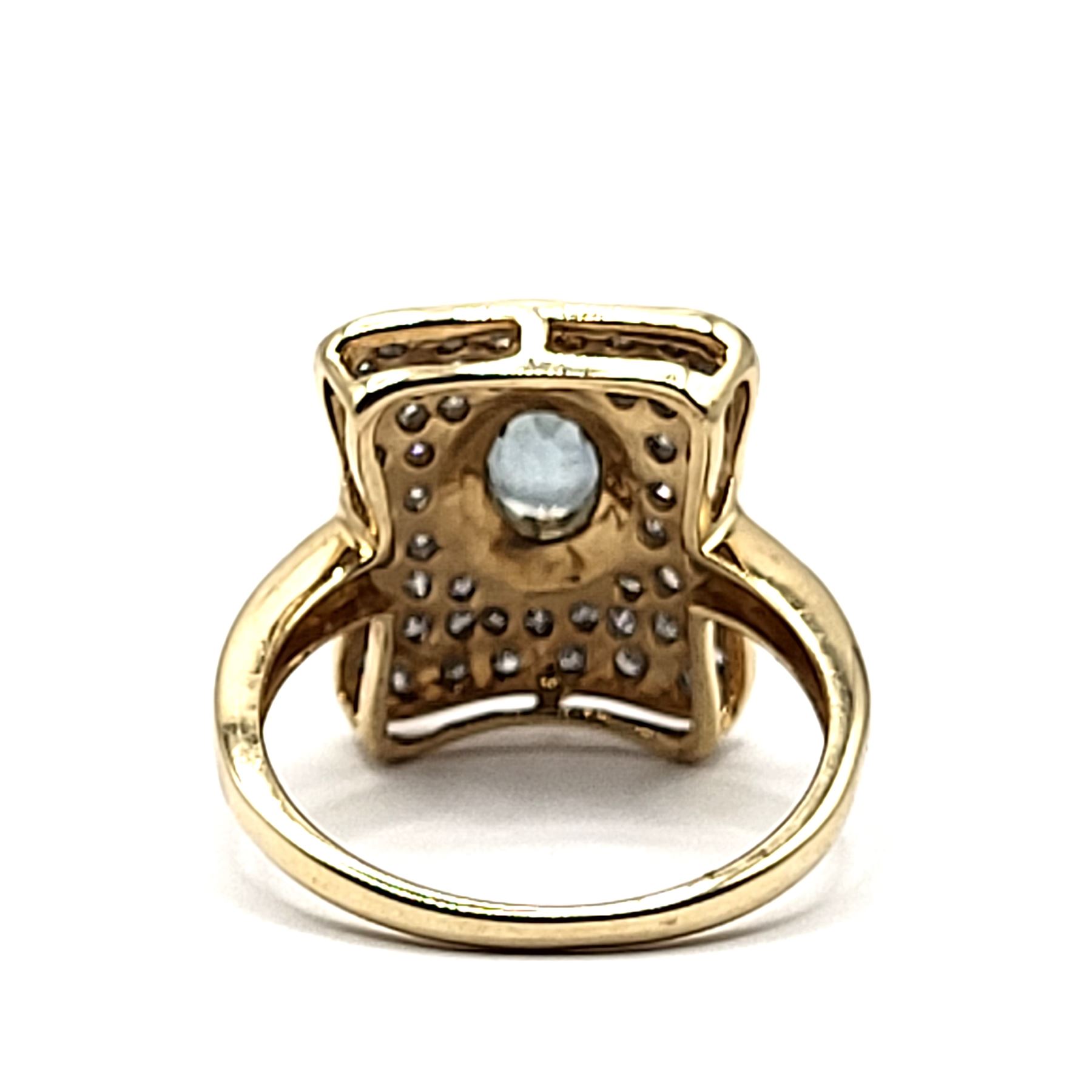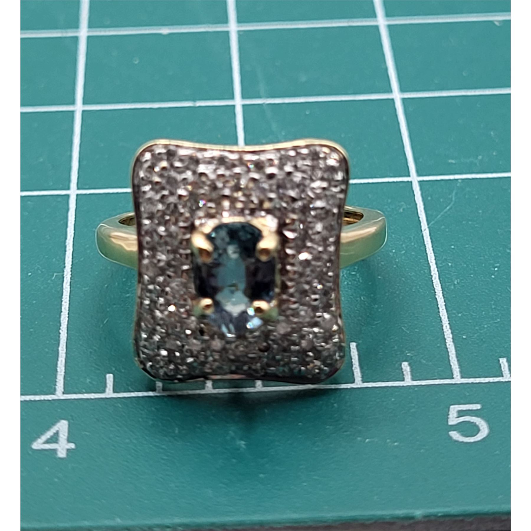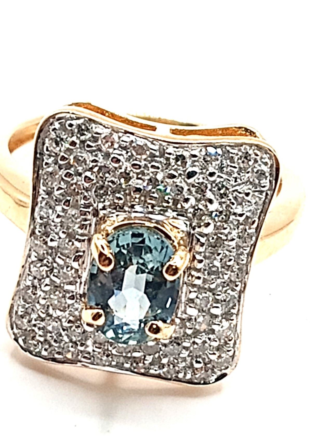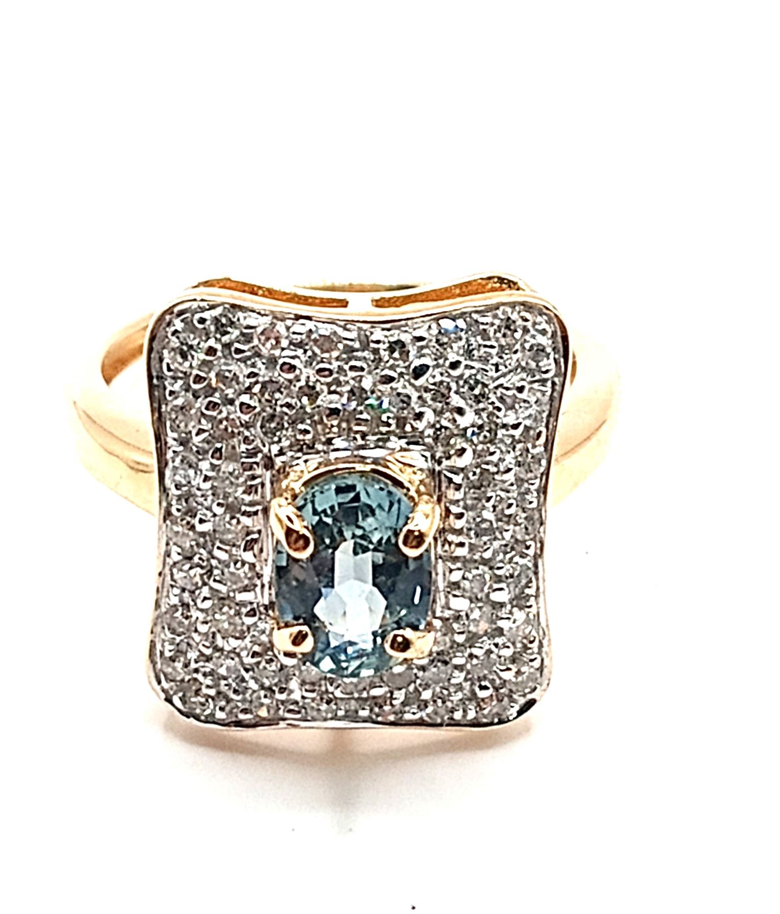This 14 karat yellow gold ring is riveting with an approximate 1.00 carat oval-cut, genuine sapphire with a color like & quot;stone-washed& quot; denim!& nbsp; The blue sapphire is raised above a curved, rectangular-shaped frame & quot;paved& quot; with approximately .50 carats total weight of round, faceted, diamonds that are approximately I-J color, and I1 clarity. The top of the ring is approximately 5/8& quot; x 1/2& quot;. This ring is US size 6.5 and can be sized for an additional charge. Please contact Bidfair Fine Jewelry for sizing details& nbsp; Admin: 33109/17bte