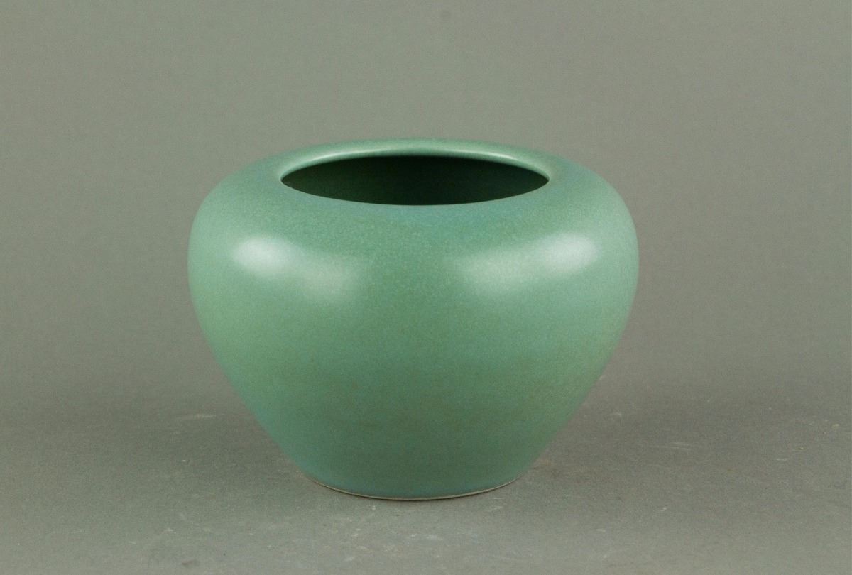 Chinese fine porcelain waterpot; of tapered sides with inverted rim; overall covered in light green glaze; six-character Ming Jiajing mark on base; H: 7 cm, D: 10 cm, 266 grams