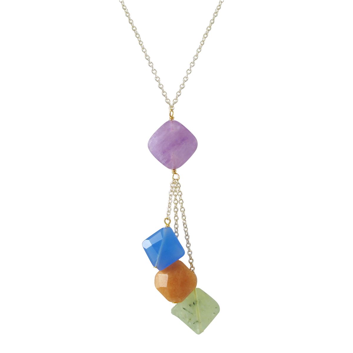 Light Multi Color Combination Semi Precious Stones Lariat Style Necklace, Gold Plated Brass Chain, 16" 2"