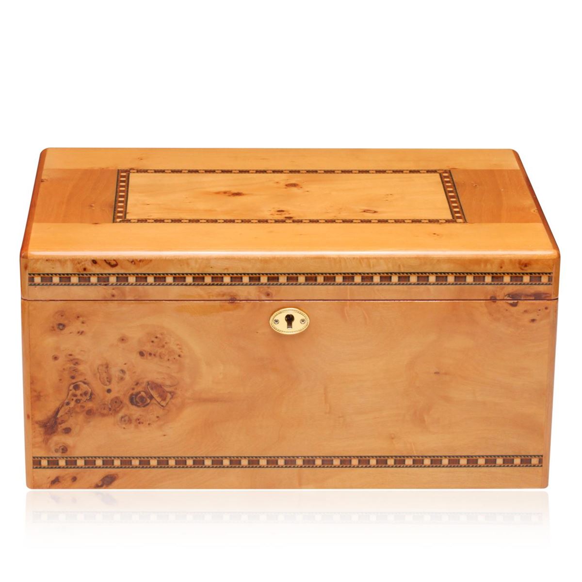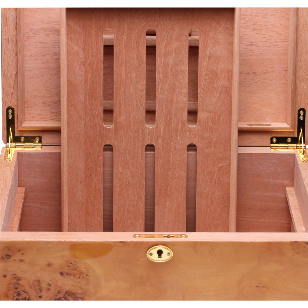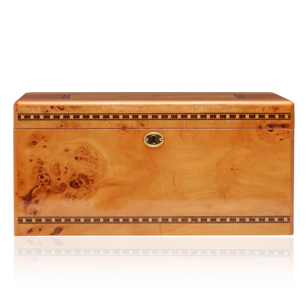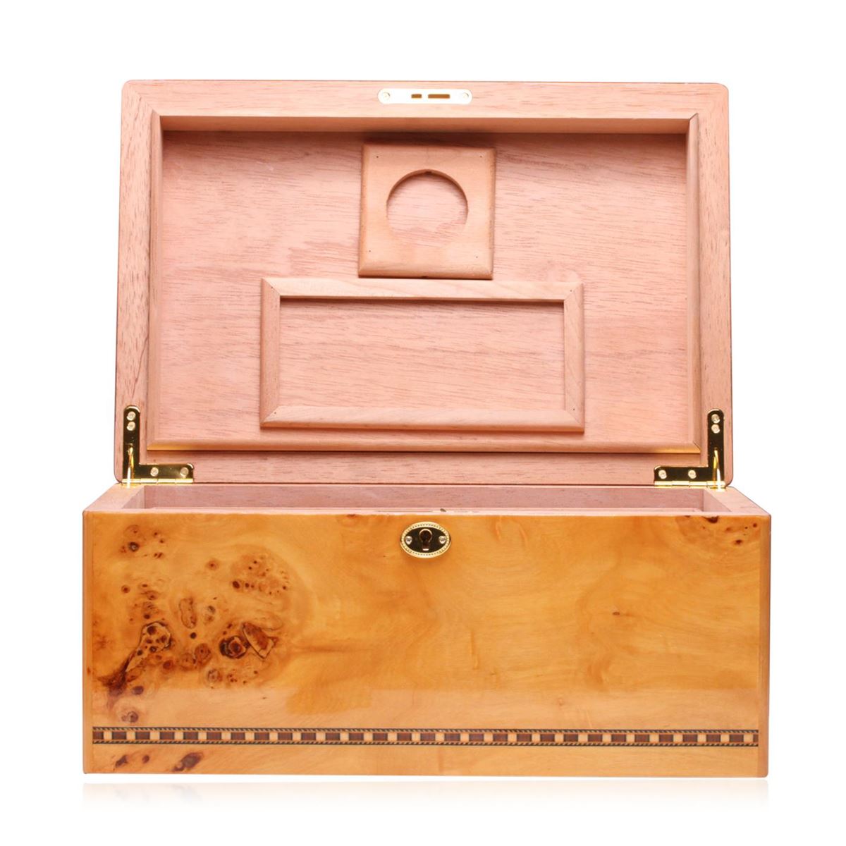 One deluxe cigar humidor featuring a glossy light wood exterior lined with premium Spanish cedar and solid brass hardware. Beautifully handcrafted to provide your cigars with the perfect environment for storage. This deluxe humidor will surely enhance your cigars smell and taste. Includes: Humidor, Hygrometer, Humidification System, Accessories, Instructions Manual. Measures 13 x 6.5 x 9.5 inches.
