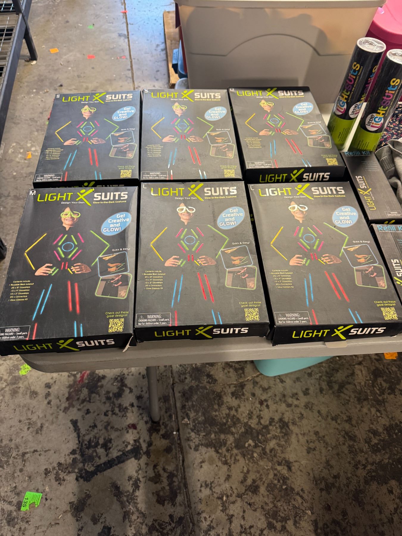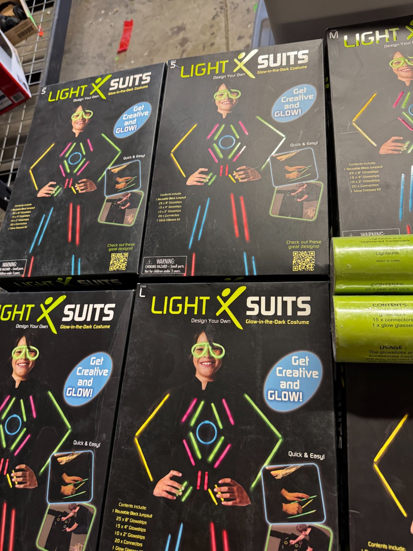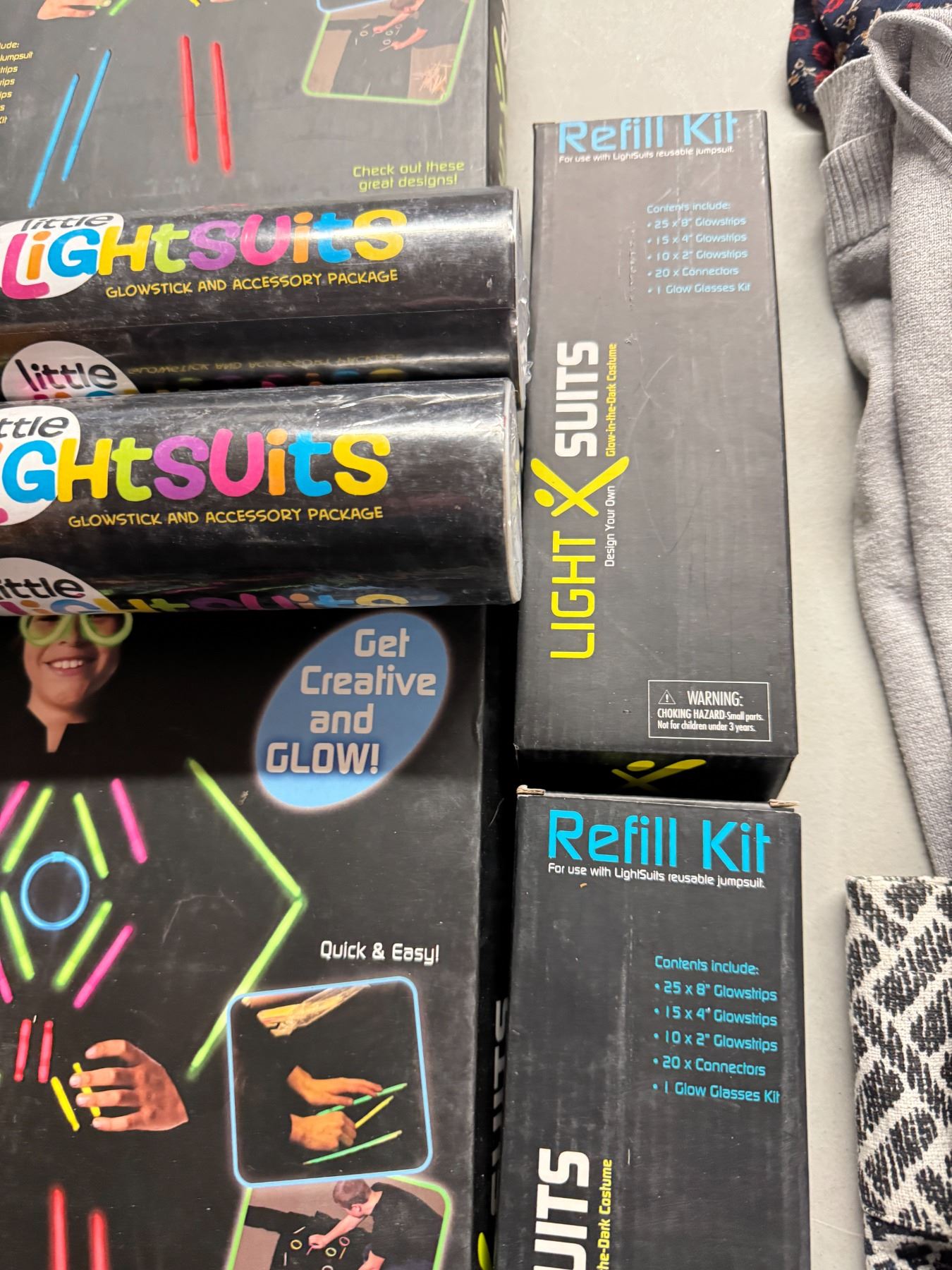 Light suits, small, medium and large refill kits and fill stick glow sticks