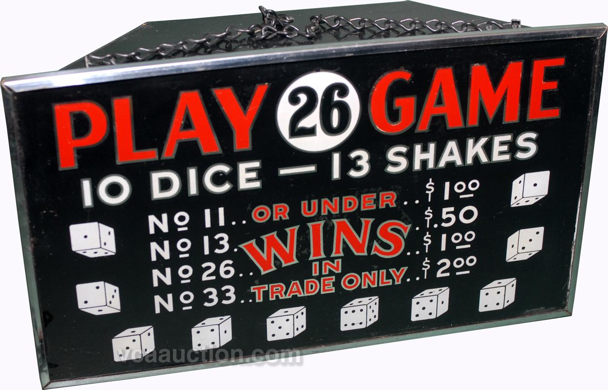 Lighted ‘26' Game Sign - Lighted sign for the once popular dice game of ‘26.’ Would make a great display alongside a dice mat and ten dice! Good working condition with hanging chains; measures 20" by 9", c1940s