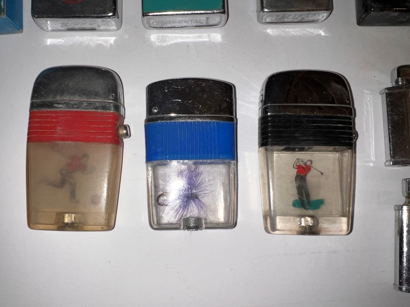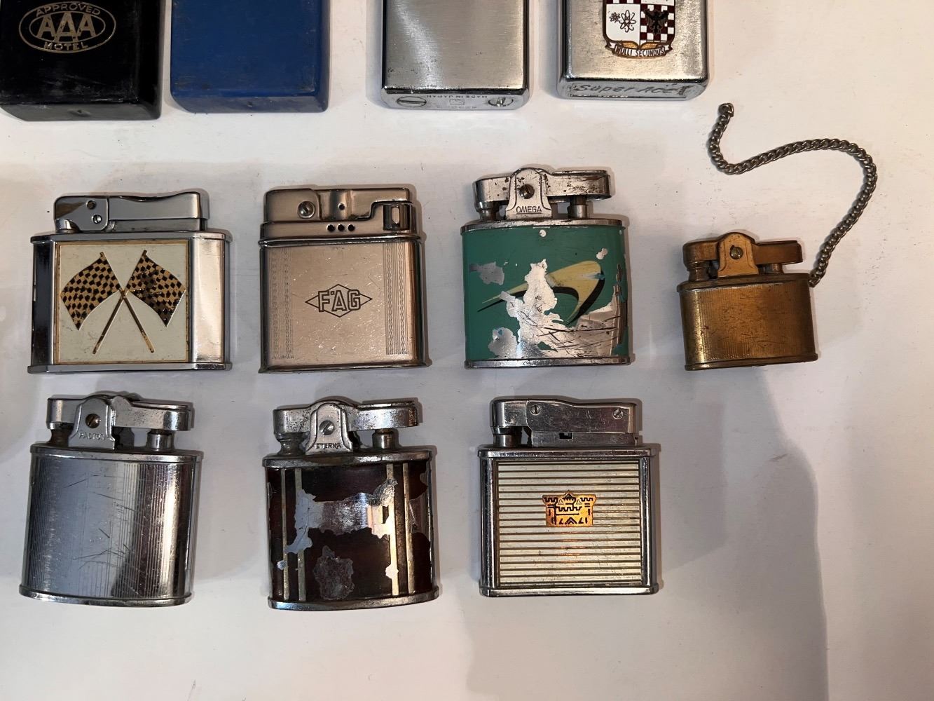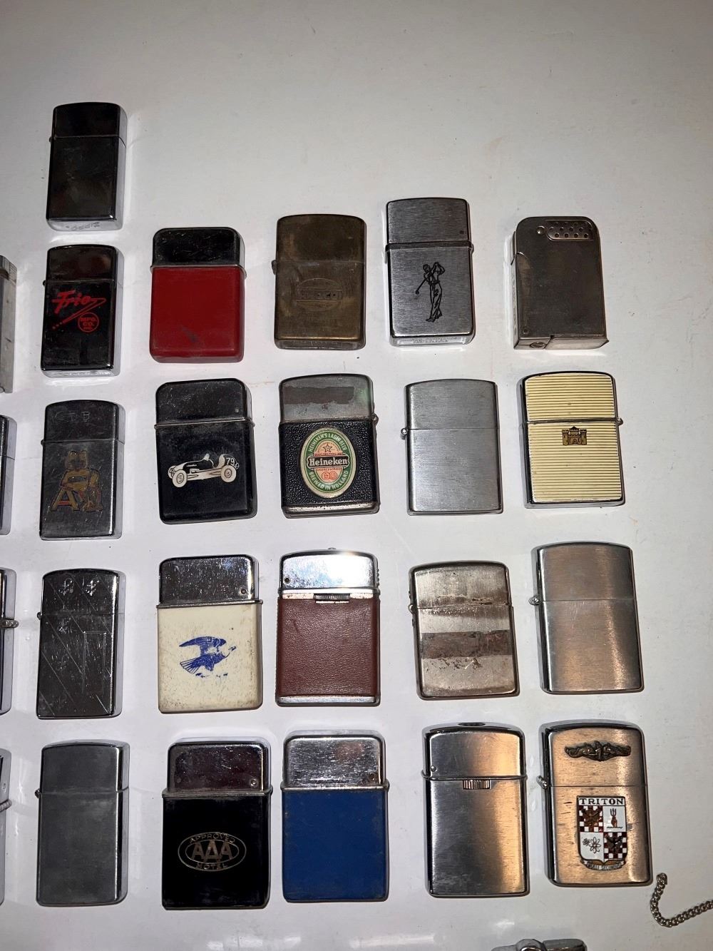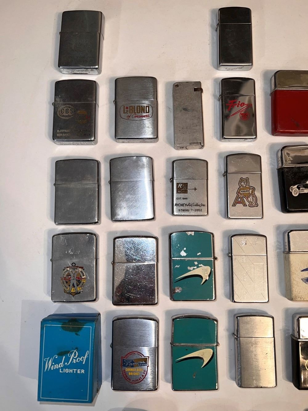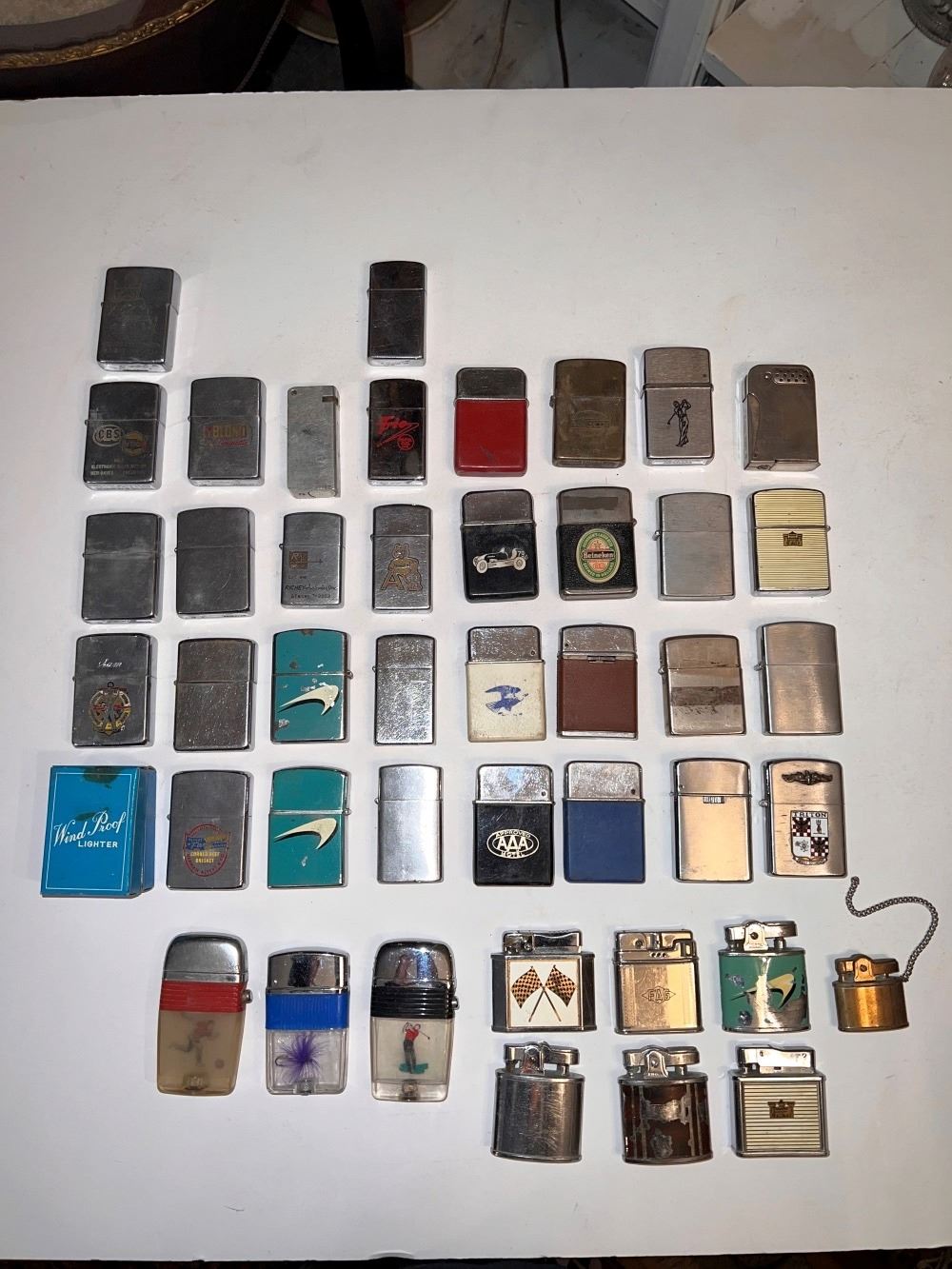 Collection of advertising and military lighters.Companies/brands include Zippo made in Bradford, PA. Colvair Slide-o-matic made in Japan, Hadson made in Japan, Wind Proof Lighters, Continental made in Japan, Omega made in Japan, Rogers Lighters, Eterna made in Canada, PAC made in Japan, Kugelfischer, Dundee, Firemaster made in Austria, Alco made in Japan, Sarome made in Japan, Champ-ette made in Austria, Super Ace made in Japan, Team Super made in Austria, Rogers Inc. made in Japan, Pacton made in Japan and some made in the U.S.A. Approx. 44 lighters, from the lifetime collection.