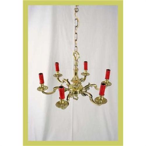 </STRONG>Title: 1950 Belgian 6-Arm Red Lighting Chandelier </STRONG><P>Item #: 7-9-0</P><P>Comment: Nice curves make this a pretty piece for any room!</P><P>Condition: In overall good condition. Shows wear to candlesleeves and significant wear to finish due to age and use.</P><P>Dimensions (in.): 14H 20.5W 20.5D </P><P>Age (ca.): 1950</P><P>Origin: Belgium</P><P>Size: 6-Arm</P><P>Color: Red</P><P>Style: Lighting</P><P>Material: Brass</P><P>Object: Chandelier</P><P>Piece Type: Lighting</P><P>Special Message: <P>Our chandeliers are typically measured from lowest point of the bottom of chandelier to the cover that attaches to ceiling. If you have any questions regarding height or other dimension of a particular chandelier, please contact EuroLuxAntiques. We will not be held responsible for misunderstandings due to the way we measure the size of our chandeliers. Chandeliers listed by EuroLuxAntiques were functioning in our retail location at the time of listing on various online sales channels, however, EuroLuxAntiques and EuroLux Imports, Inc., makes no warranties, express or implied, regarding safety, future functioning, fire hazard or compliance with applicable building codes in your area. We recommend that you seek the advice ...
