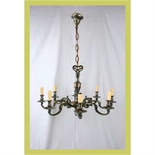 </STRONG>Title: 1950 Belgian 8-Arm Lighting Chandelier </STRONG><P>Item #: 7-4-0</P><P>Comment: Pretty curves and interesting design make this a great piece for any room!</P><P>Condition: In overall very good condition. One candlesleeve is shorter than others but is not really noticeable from ground. Some wear to finish due to age and use.</P><P>Dimensions (in.): 18.5H 30L 29.5W 29.5D </P><P>Age (ca.): 1950</P><P>Origin: Belgium</P><P>Size: 8-Arm</P><P>Style: Lighting</P><P>Material: Brass</P><P>Object: Chandelier</P><P>Piece Type: Lighting</P><P>Special Message: <P>Our chandeliers are typically measured from lowest point of the bottom of chandelier to the cover that attaches to ceiling. If you have any questions regarding height or other dimension of a particular chandelier, please contact EuroLuxAntiques. We will not be held responsible for misunderstandings due to the way we measure the size of our chandeliers. Chandeliers listed by EuroLuxAntiques were functioning in our retail location at the time of listing on various online sales channels, however, EuroLuxAntiques and EuroLux Imports, Inc., makes no warranties, express or implied, regarding safety, future functioning, fire hazard or compliance with applicable building codes in your area. ...