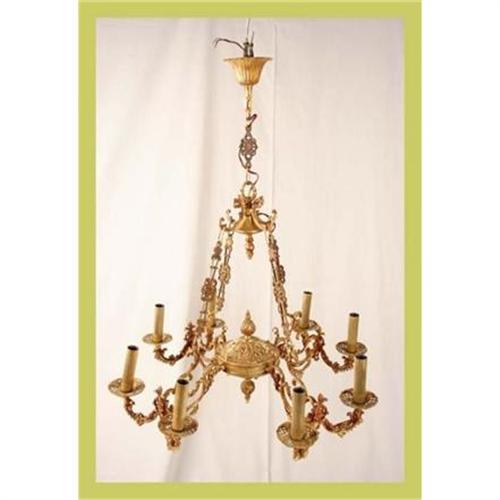 </STRONG>Title: 1960 Belgian 8-Arm Lighting Chandelier Rococo </STRONG><P>Item #: 7-25-0</P><P>Comment: Pretty design and golden ribbed candlesleeves make this a beautiful piece in any room!</P><P>Condition: In overall very good condition. Some wear to candlesleeves and finish due to age and use.</P><P>Dimensions (in.): 22H 24W 24D </P><P>Age (ca.): 1960</P><P>Origin: Belgium</P><P>Size: 8-Arm</P><P>Style: Lighting</P><P>Material: Brass</P><P>Object: Chandelier</P><P>Subject: Rococo</P><P>Piece Type: Lighting</P><P>Special Message: <P>Our chandeliers are typically measured from lowest point of the bottom of chandelier to the cover that attaches to ceiling. If you have any questions regarding height or other dimension of a particular chandelier, please contact EuroLuxAntiques. We will not be held responsible for misunderstandings due to the way we measure the size of our chandeliers. Chandeliers listed by EuroLuxAntiques were functioning in our retail location at the time of listing on various online sales channels, however, EuroLuxAntiques and EuroLux Imports, Inc., makes no warranties, express or implied, regarding safety, future functioning, fire hazard or compliance with applicable building codes in your area. We recommend ...