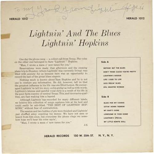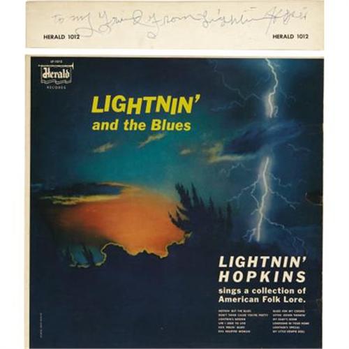 <B>Lightnin' Hopkins <I>Lightnin' And The Blues</B></I> Autographed LP (Herald 1012, 1960).</B></I> Sam "Lightnin" Hopkins, iconic Texas Bluesman, had first recorded some 14 years earlier in 1946. This was his first album, issued about the time Lightnin', at age 48, was finally being widely acknowledged as a Country/Blues great. The album, along with his "Mojo Hand" on the Fire label, is considered his rarest and most sought-after of the dozens ultimately released on some 36 labels! The record is quite nice; the cover has minor repair on the front bottom right corner and three tape stains on back cover. Condition: EX 7/ VG-EX 6. <I>Accompanied by a COA from PSA/DNA.</B></I><BR><BR><b>Shipping:</b> Recordings (<a target="_blank" href="http://www.heritageauctions.com/common/shipping.php">view shipping information</a>)