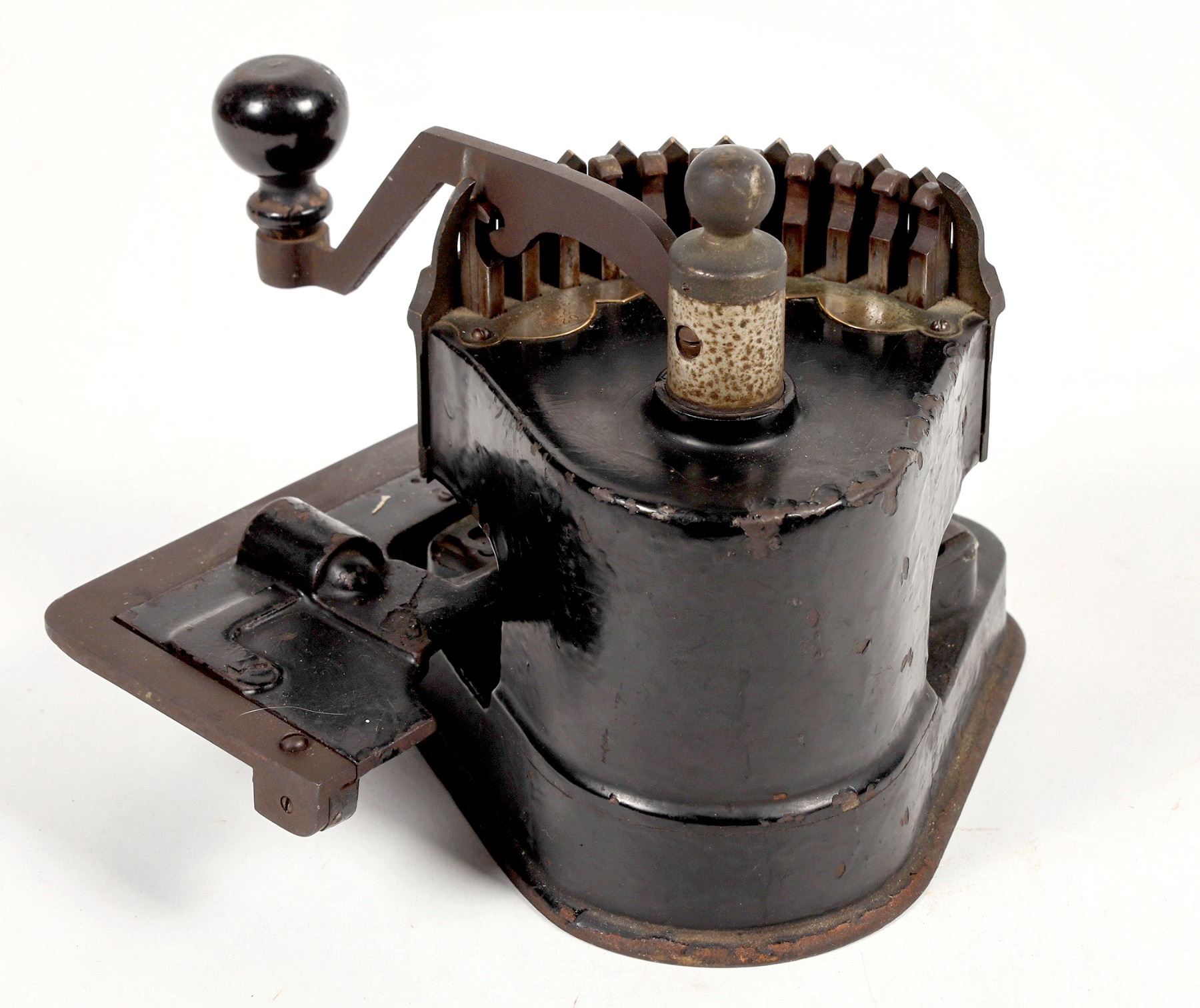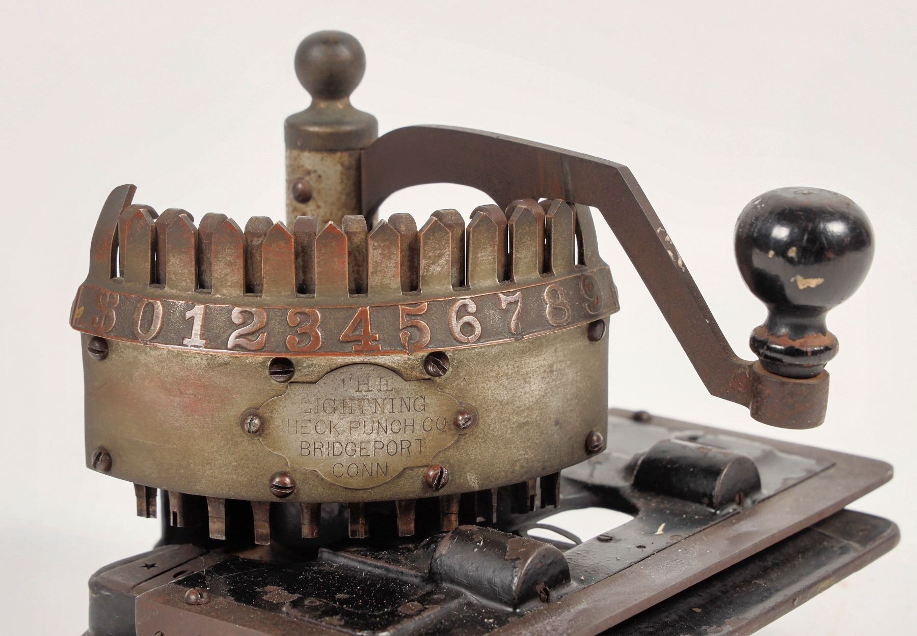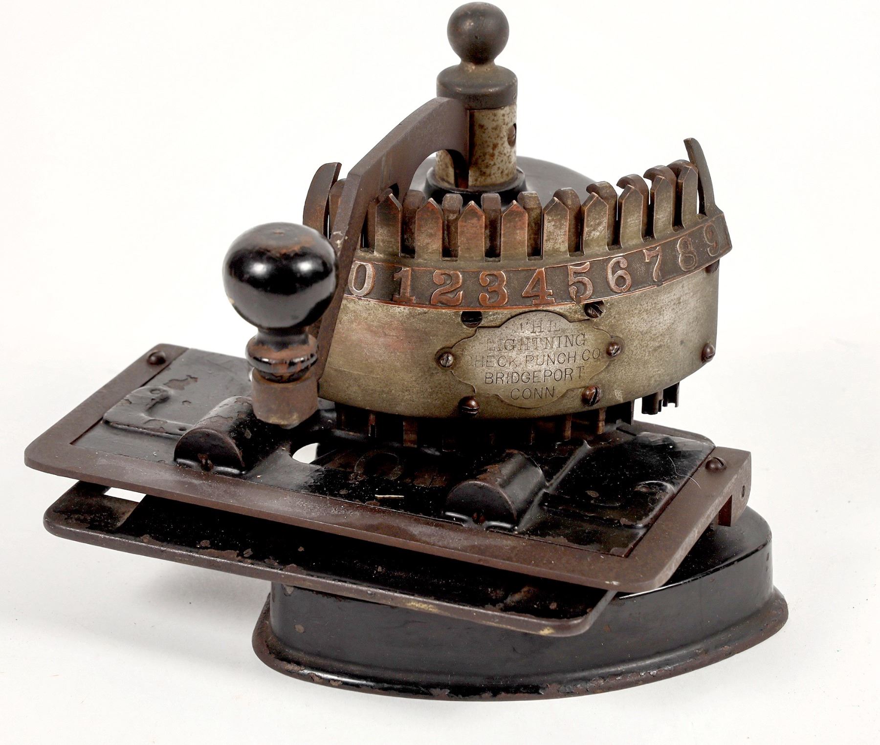 Bridgeport, CT plate. A numerical safety device for checks and other financial documents. Used to punch checks and stocks so that the company could know it was authentic and not a copy. 7" L x 6" D x 6"H. Elongated brass label on top with 8 patent numbers, patented 1890. Very fine condition. First one we've ever had.