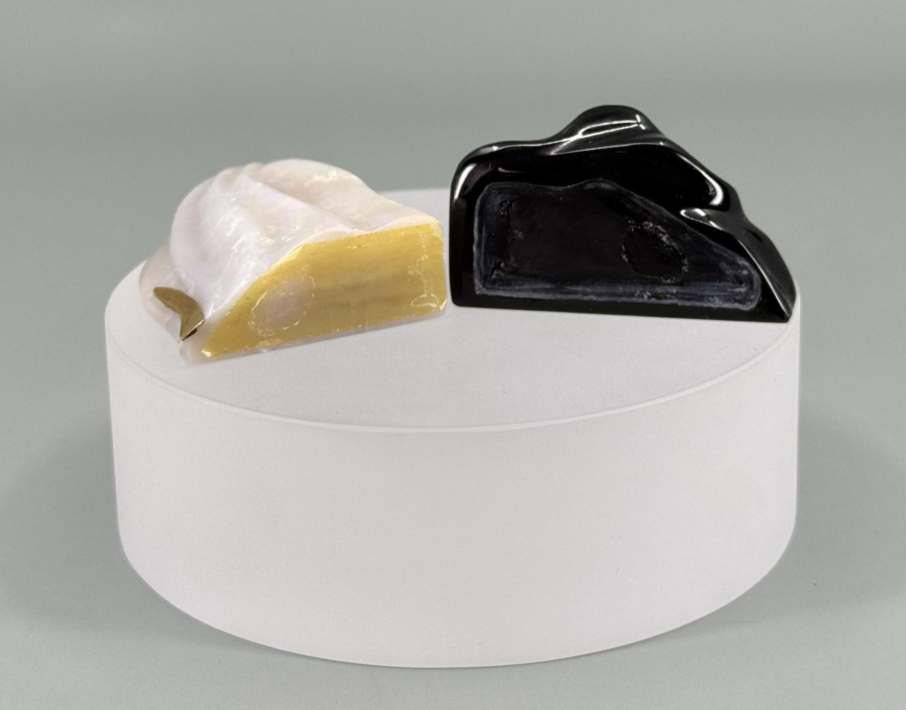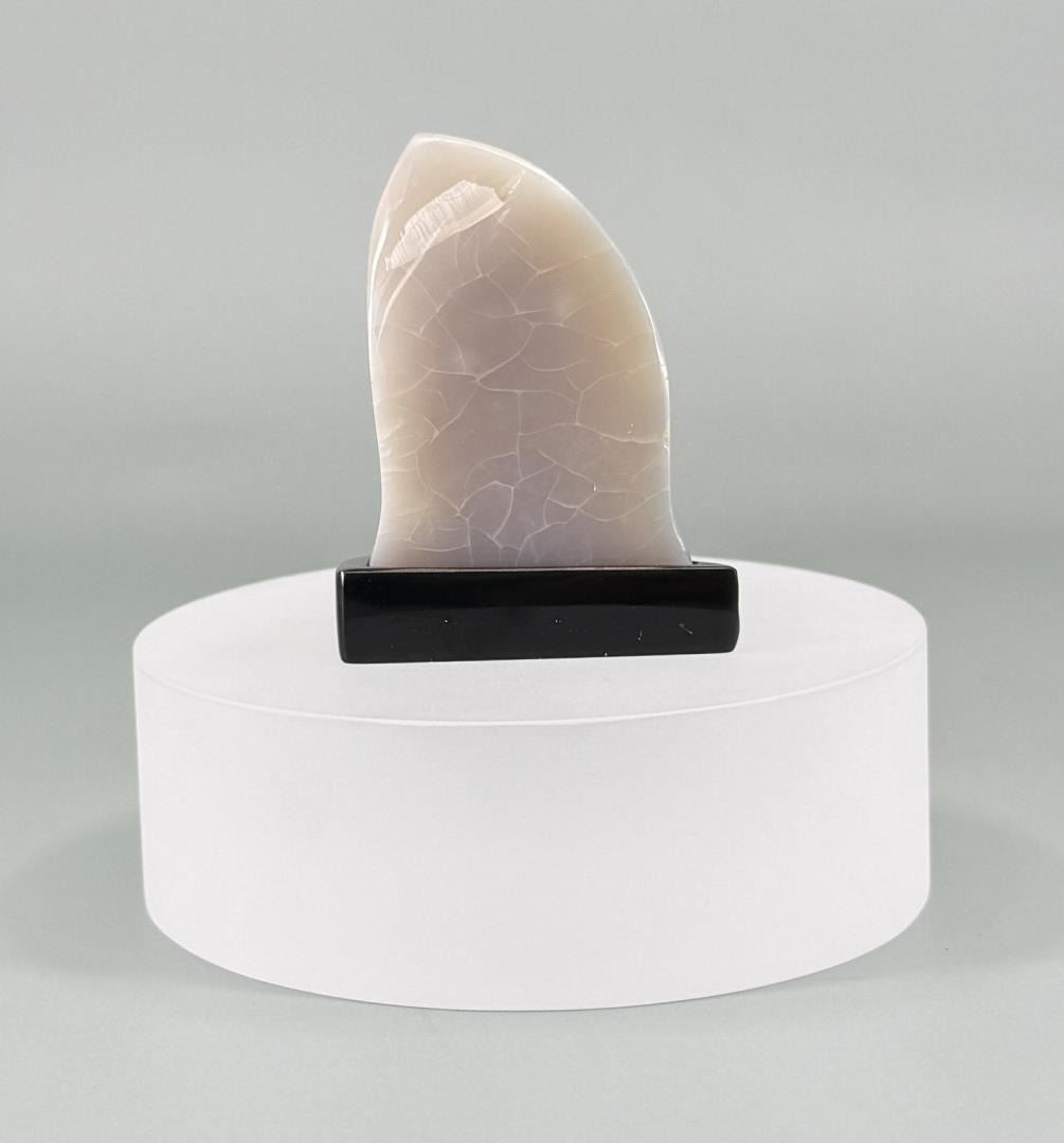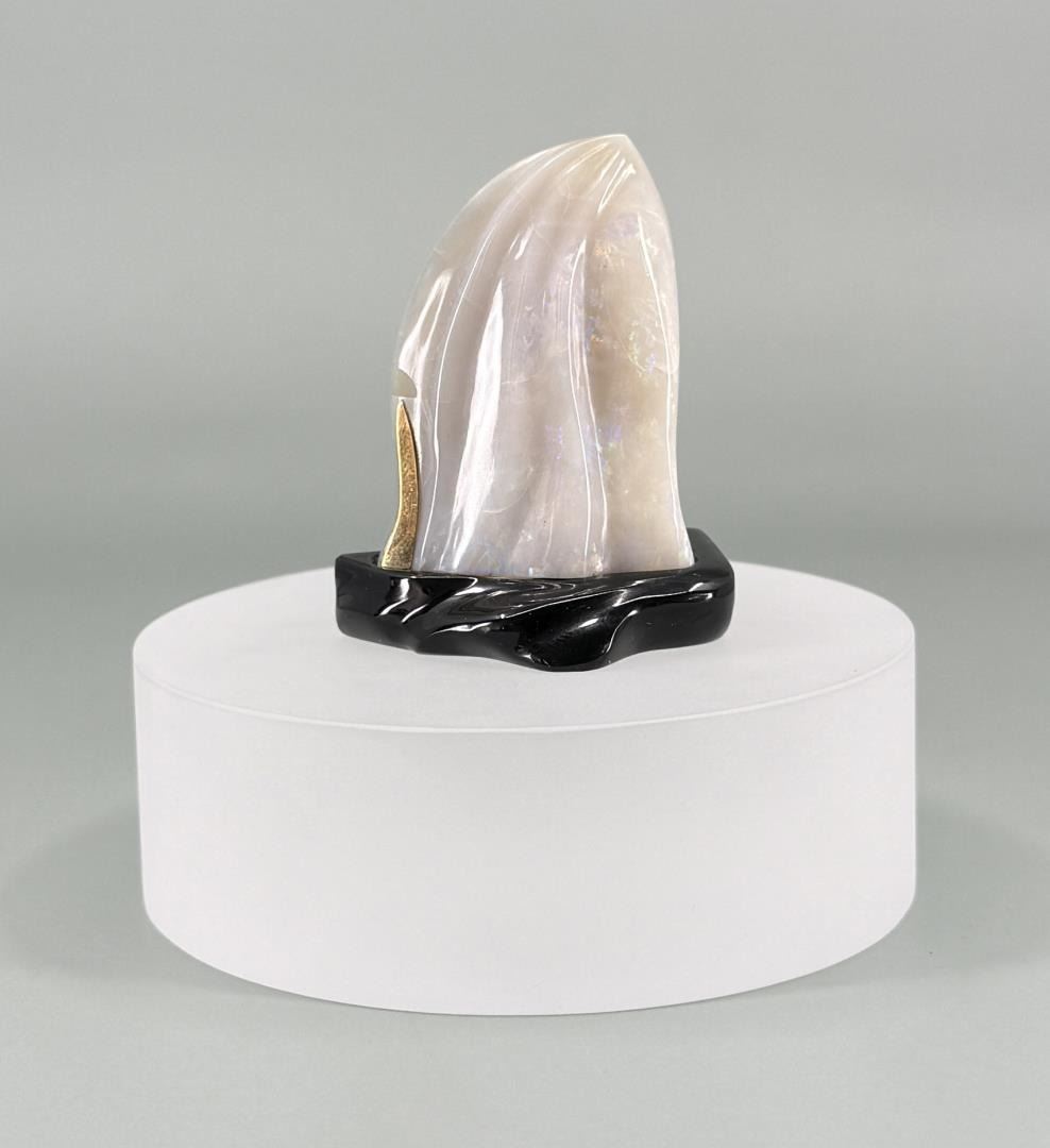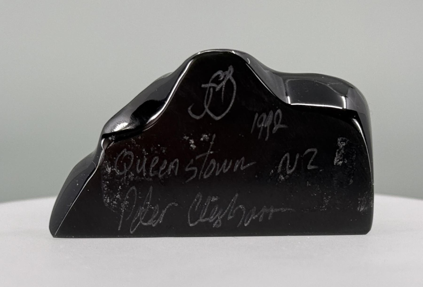 Set with a piece of 14k Gold. 2 1/4" by 1 3/4" by 2" on stand. Carved in Queenstown New Zealand in 1992, singed on bottom of base.