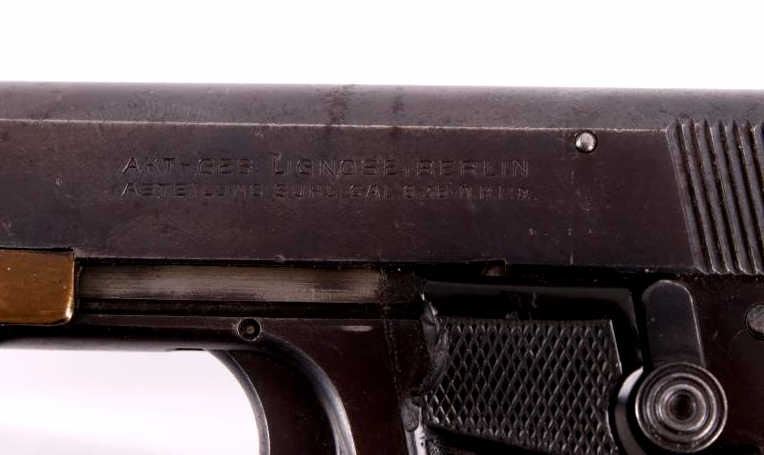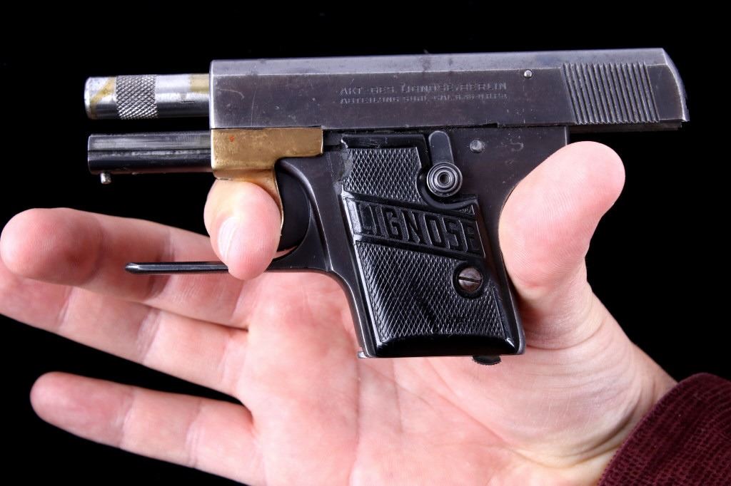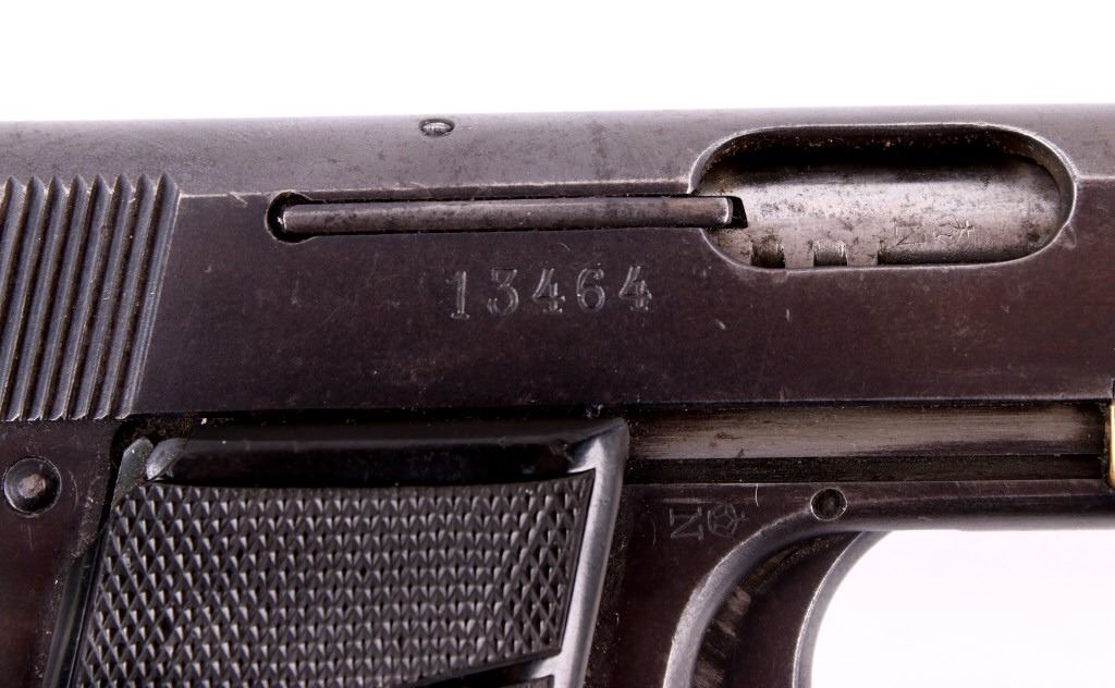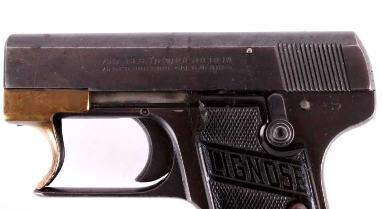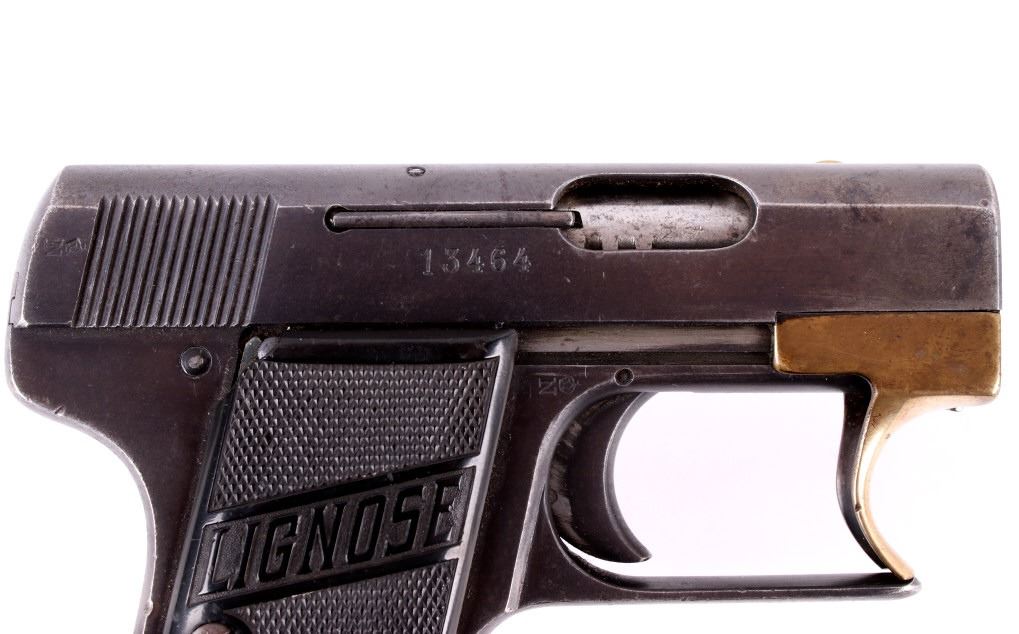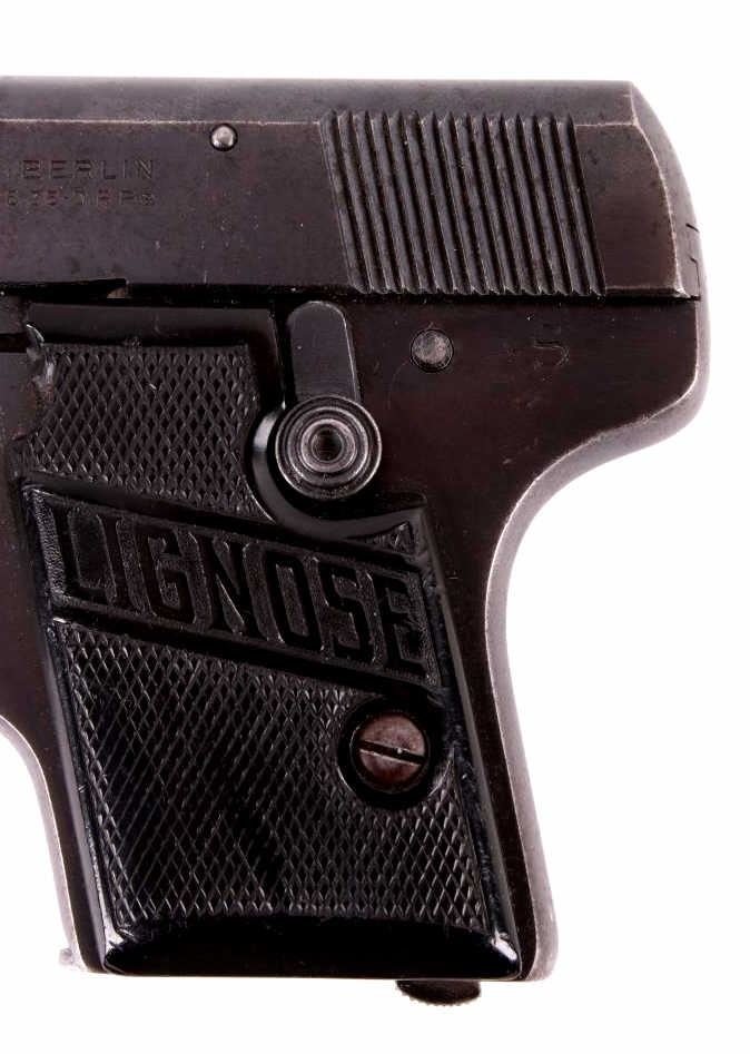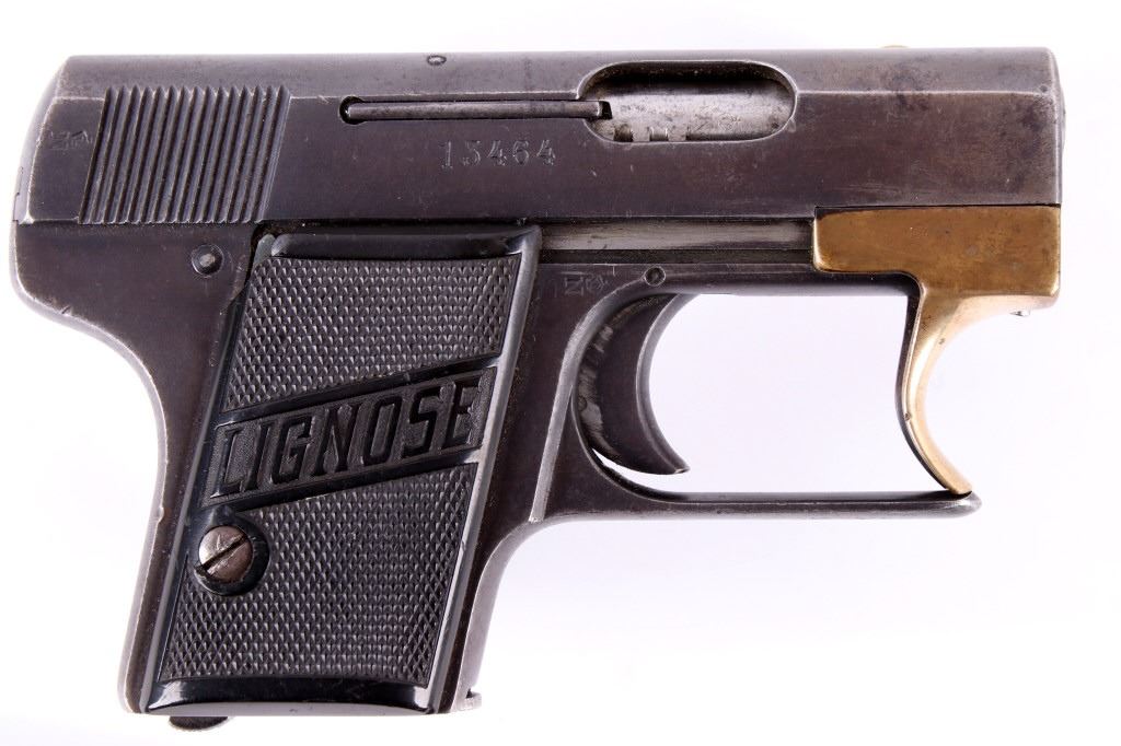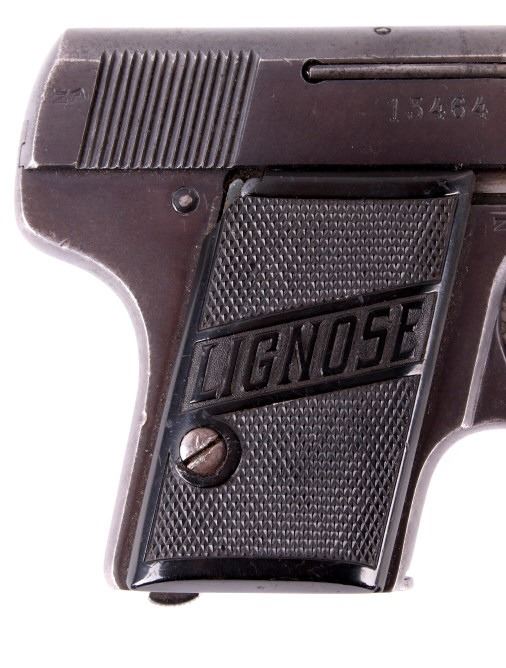 Included in this lot is a Lignose 2A Einhand semi-automatic .25 ACP pistol. This pistol is well known for its unique design in that it can be cocked with one hand. Einhand in German in fact means one handed. The pistol features a brass retractor which doubles as the front of the trigger guard. The pistol is chambered in .25 ACP and has black plastic grips which show chips on both the left and right side. The slide is marked "AKT - GES Lignose, Berlin - Abteilung Suhl - Cal. 6.35 D.R.P.a." on the left and the serial number on the right. The safety on the pistol also holds the slide open. There is a brass pin on the back of the pistol that indicates weather or not the firearm is cocked. The front of the slide is routed and features a raised front sight. Serial Number: 13464. This firearm qualifies as a Curio & Relic Long Gun, and requires FFL Transfer or NICS Background Check.