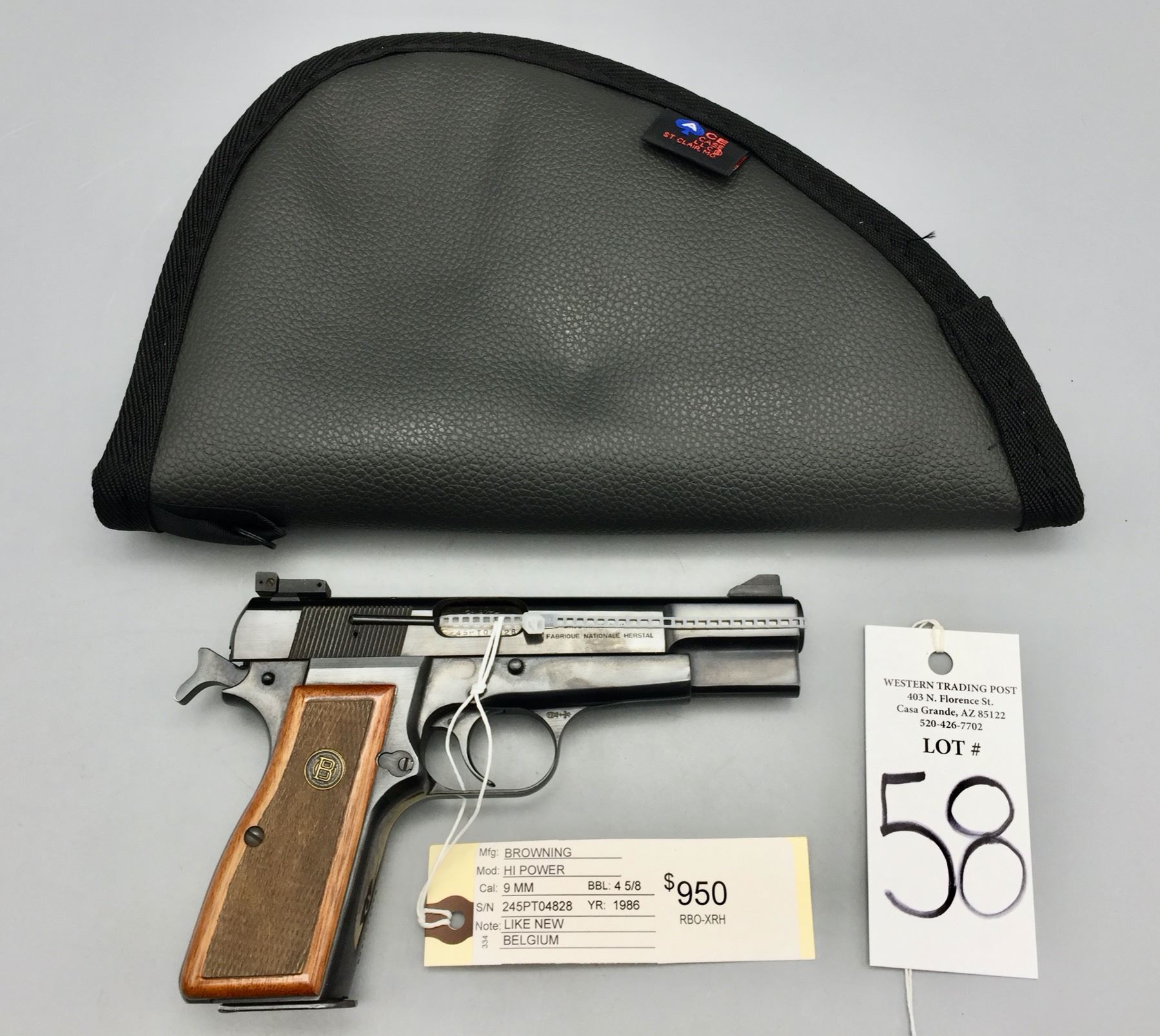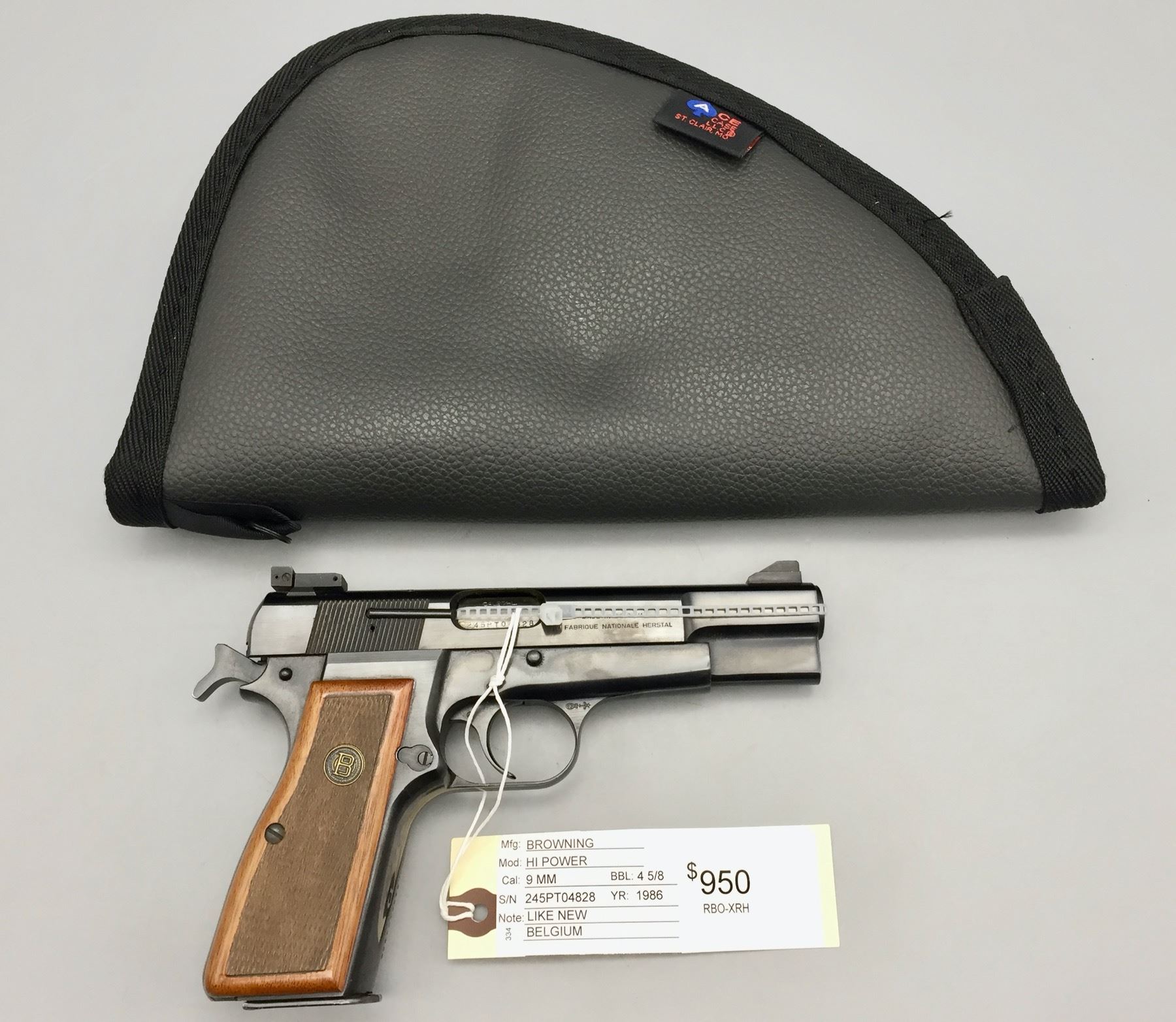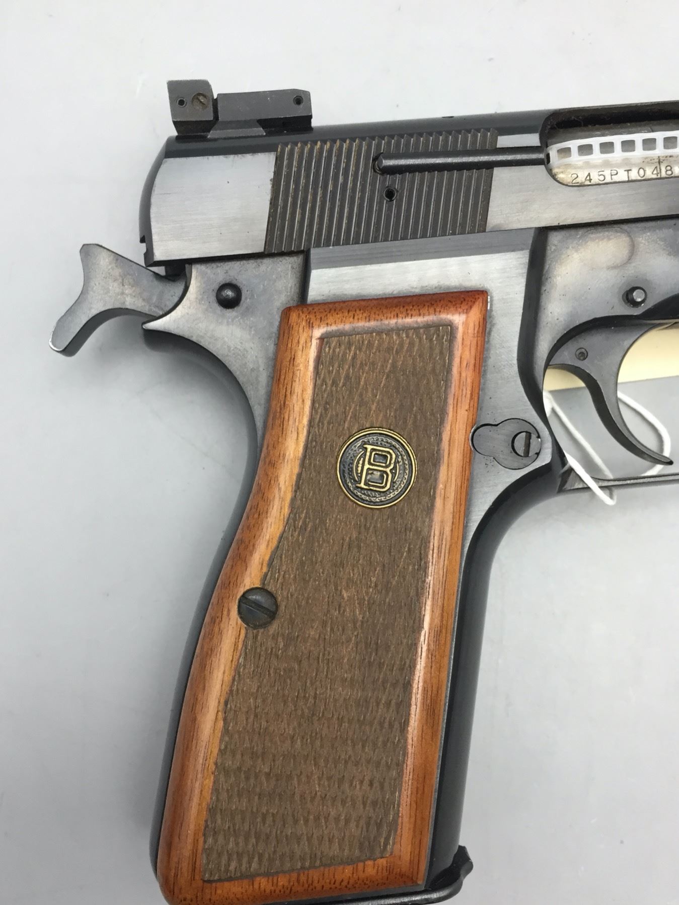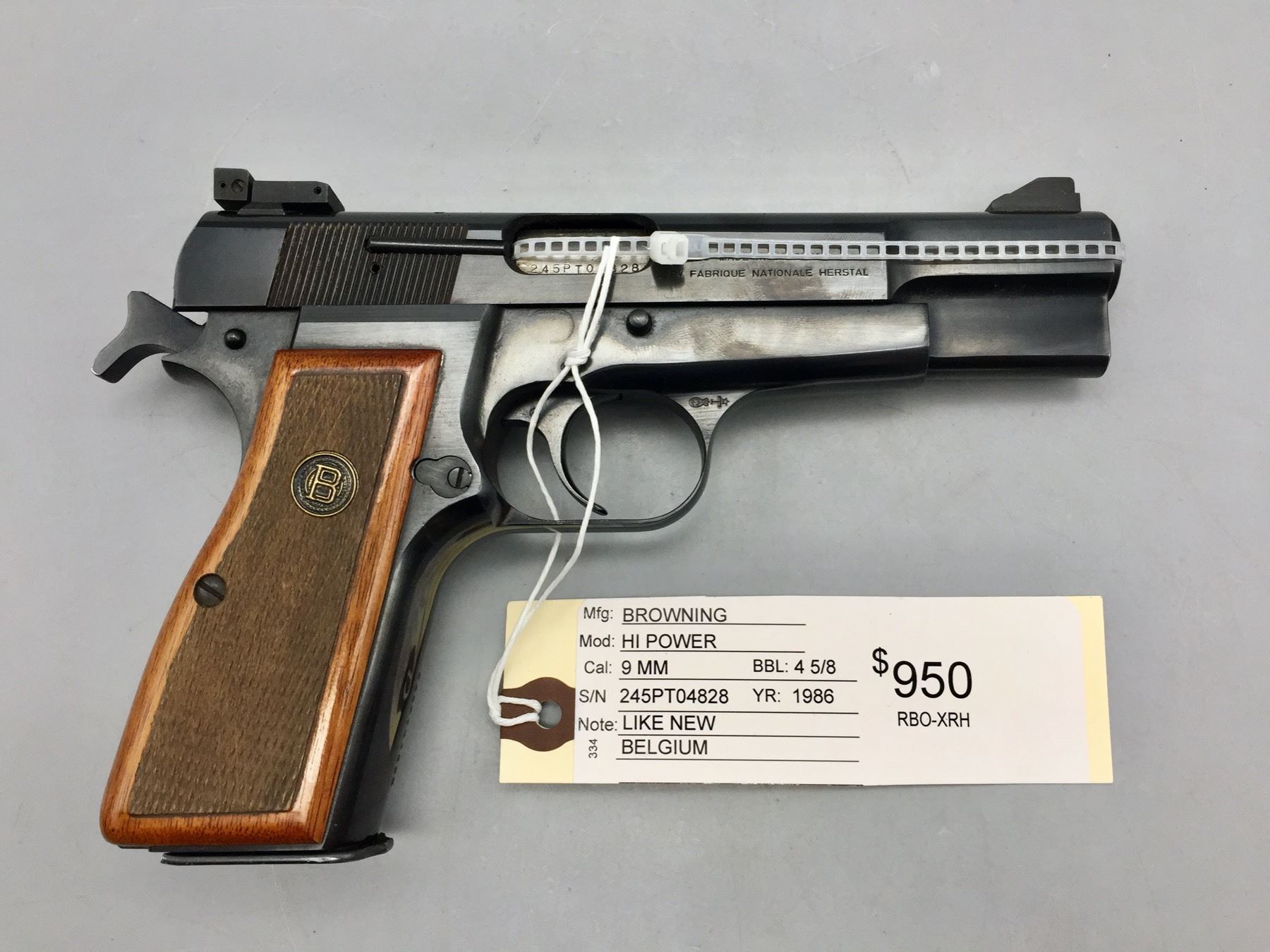Description: Offered for sale in this lot is a Browning Hi Power 9mm pistol with wood grips in like new condition. Includes a padded pistol case. Maker: Browning. Approx. Age: 1986. Serial No. 245PT04828. Size: Barrel measures 4-5/8 inches long. Condition: Very good to excellent for its age, minor wear expected. Please look closely at the pictures - they are an important part of our description. Shipping: There will be a $15 handling, packaging fee for shipping this lot. The actual cost of postage will be added on top of that. *****This firearm requires an FFL Transfer*****