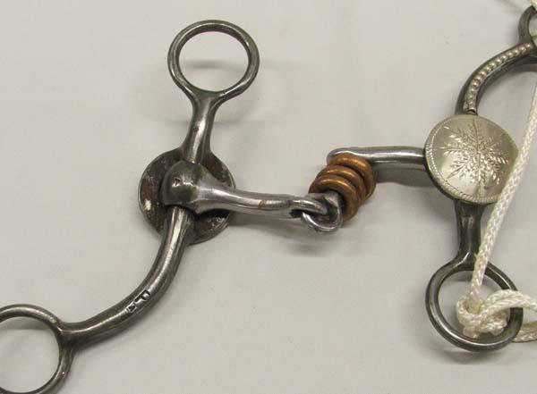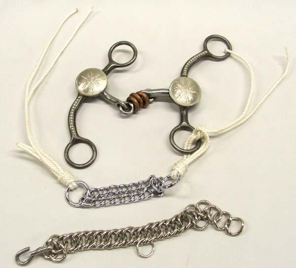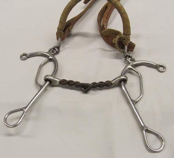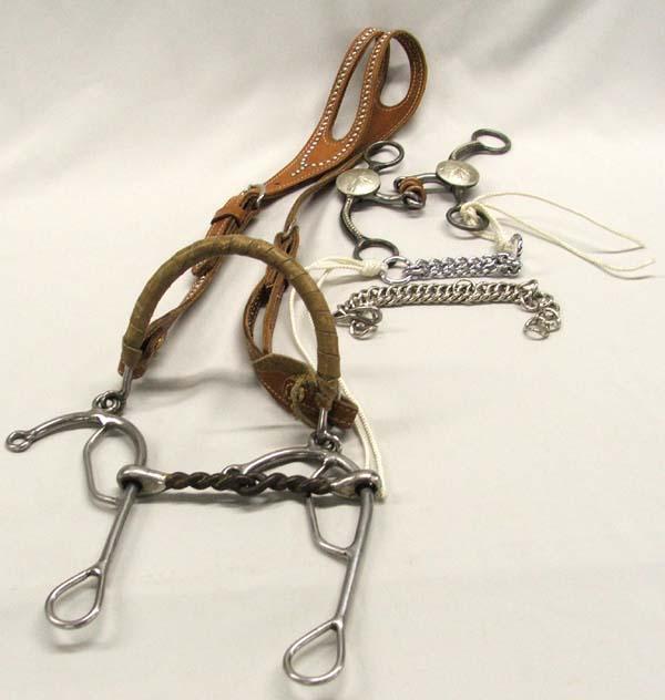 Like New Cowboy Bits & Leather Head Stall. Decorative metal on the head stall. 2 Metal shin straps. Headstall measures approx. 18'' on smallest adjustment. SHI $20.