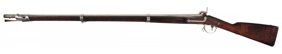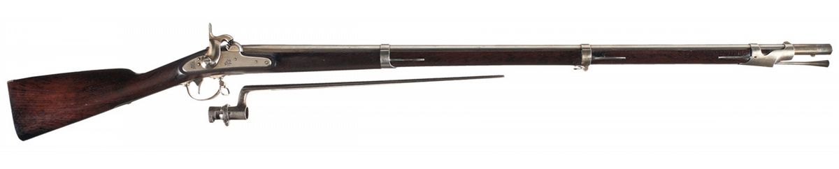 Condition: Excellent with most of the original Armory Bright style finish remaining, mixed with an old dried grease/brown colored patina around the edges of the metal and wood. The metal markings are crisp and sharp and the screws are crisp. The only exception is that there is a filed groove right through the date on the tan, possibly intened to be used as an index mark for the tang alignment. The stock is also like new with the original raised grain/feathered appearance to the wood. The lock plate and side plates mortised flat areas are crisp and sharp and show no wear or handling marks and the cartouche is crisp and sharp. The bayonet is good showing an old cleaning with light pin-prick pitting in various areas.