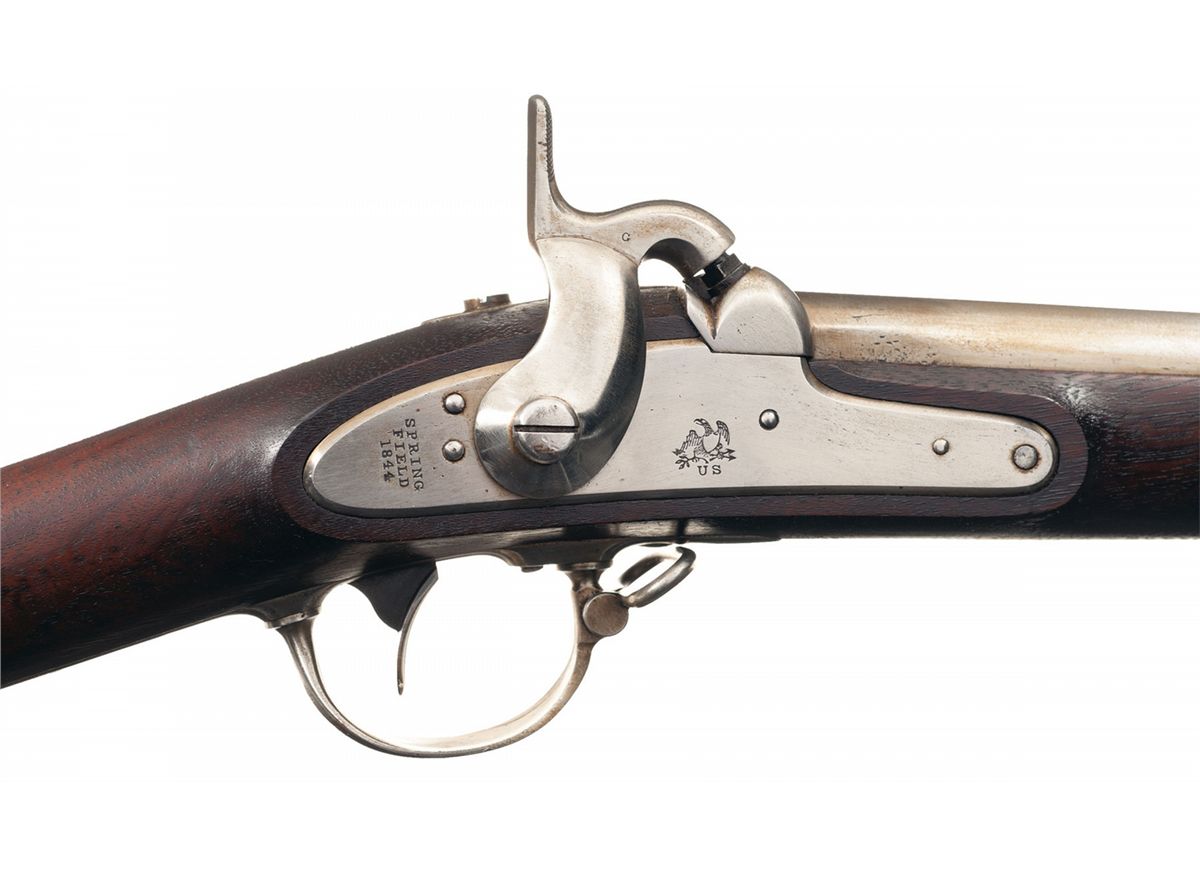 This is a beautiful example of an all original unaltered, near new Springfield Model 1842 musket as manufactured by Springfield Armory. This series of rifle was manufactured by Harpers Ferry from 1844 to 1855 and has the distinction of being the first regulation percussion firearm manufactured in a national armory and the first U.S. firearm manufactured with interchangeable components. The Model 1842 musket was the primary infantry weapon of both the Union and Confederate Armies during the first two years of the Civil War. It was still carried in significant quantities by both armies as late as 1863 and was not fully replaced by the .58 caliber rifle-musket at the end of the war. This particular example is a early production model with the lock marked "SPRING/FIELD/1844" behind the hammer with the eagle/shield motif over "US" ahead of the hammer. The barrel tang is dated "1844" and the left rear of the barrel is marked with the "V/P/eagle head" proof marks. The musket has an arsenal bright metal finish overall and is fitted with a full length, one-piece oil finished black walnut stock. The left flat is marked with a single "JAS" cartouche in a small oval. with a small letter "L" sub-inspectors on the trigger guard bow. The top of the buttplate tang is marked "US" and this excellent musket is complete with the original trumpet head iron ramrod and an original unmarked bayonet.