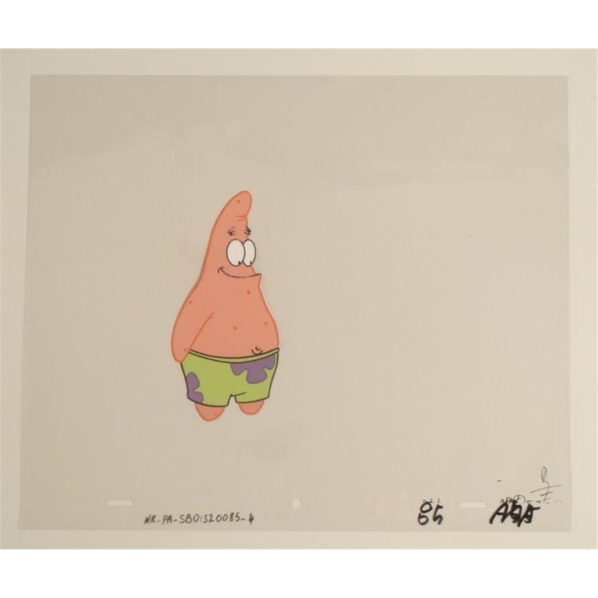 This original animation cel is from the Nickelodeon TV show SpongeBob Squarepants. The story takes place under the deep blue sea in Bikini Bottom, where SpongeBob resides. SpongeBob, who is a yellow, porous sponge, is your typical happy-go-lucky character, as he is always cheerful and enjoys making people laugh. Patrick Star, SpongeBob's neighbor who is a starfish, is your average children's show idiot, as he boasts knowing nothing and is often getting himself into ridiculous situations. Between the homes of these two lies the home of the miserable Squidward, a squid, who is known for being grouchy and playing tricks on SpongeBob and Patrick. Both SpongeBob and Squidward work at the Krusty Krab, a fast food business run by the greedy money-loving Mr. Krabs, a crab, the arch rival of the evil, possibly misunderstood, Plankton. Another neighbor, Sandy Cheeks, an athletic squirrel who normally wears an astronaut's space suit, was introduced in "Tea at the Treedome." She spends most of her time inventing and experimenting. * Patrick likes to smile * Original Production Animated Cel Overall Size of Cel: 10 1/2" x 12 1/2" Very Good ConditionThis is an original hand-painted cel set-up used in the production of an episode of "SpongeBob SquarePants." Each one-of-a-kind set-up represents a slight change in position of the characters. When individually photographed and projected in rapid succession, the images appear to move. * To create production cels, the original animator's drawing is transferred onto an acetate cel (by hand-inking and/or photo copying). The cel is then hand-painted on the reverse side. * The cel is ready to be matted and framed. The animator's notations are at the bottom of the cel. The cel has multiple layers; first is Patrick's upper body and the second cel is of Patrick's lower body. *