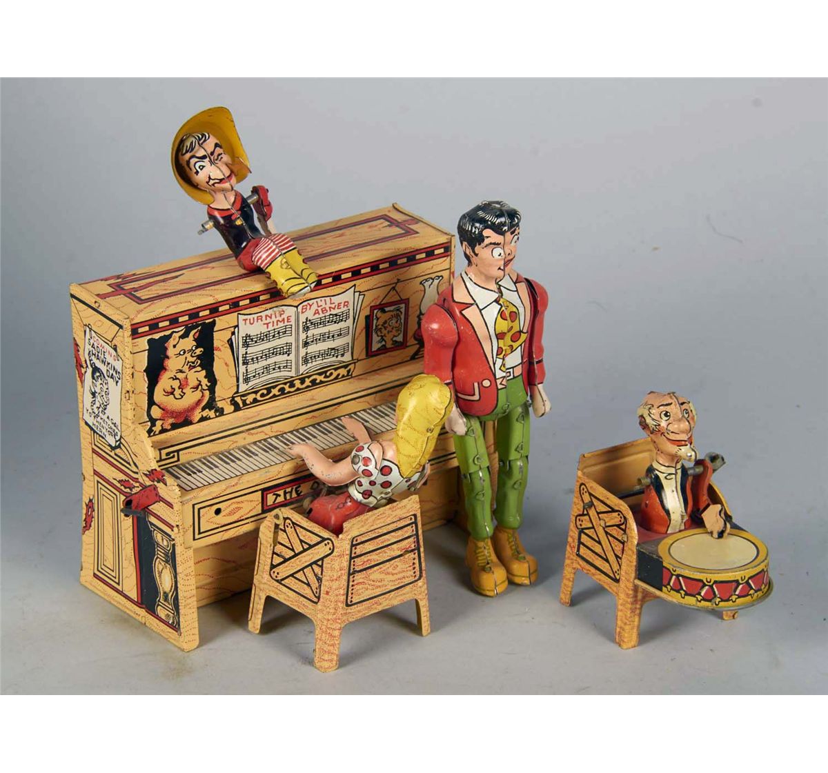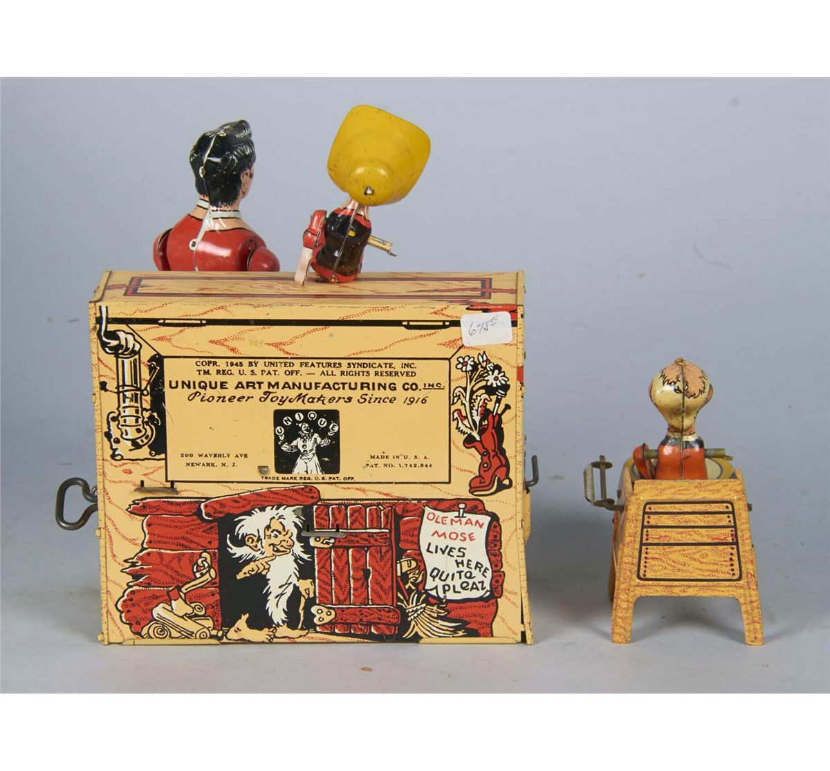 The Li' Abner tin litho wind-up mechanical toy with Lil' Abner, Daisy Mae, and Pappy and Mammy Yokum, made by the Unique Art Manufacturing Co. circa 1945. Toy is missing Mammy Yokum's arm, and Pappy Yokum's arm is damaged. Condition (Good). Size 10" x 8"