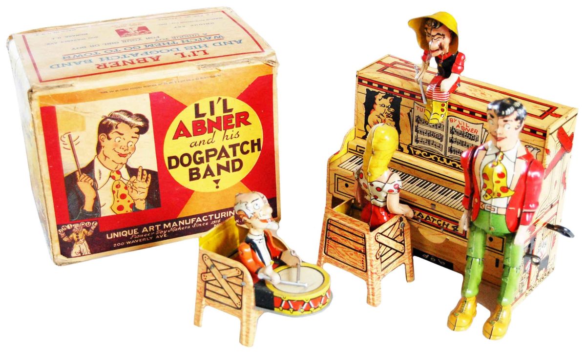 Lil' Abner and His Dogpatch Band tin wind-up toy. Unique Art Manufacturing Newark, NJ. Figures near mint, original box very good condition. 7 1/2 X 5 1/2 X 5 3/4 inches.