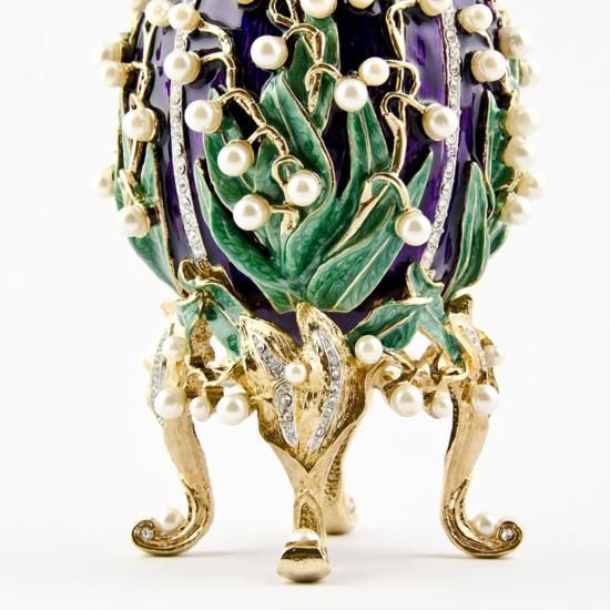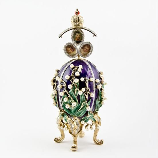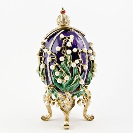 Lilies of the Valley Egg by Carl Faberge. Material: Pewter, Crystals, Enamel. Dimensions: 6.5in (H) x 2.75 (D) The famed Faberge eggs are jeweled eggs, often with the most ornate, minuscule designs on them. The House of Faberge made the original pieces from 1885 to 1917. At that time, they became popular gifts given during the Easter season. Larger versions were made for the Russian royal family, including Alexander III and Nicolas II. Of these, 42 of the 50 originals exist today.