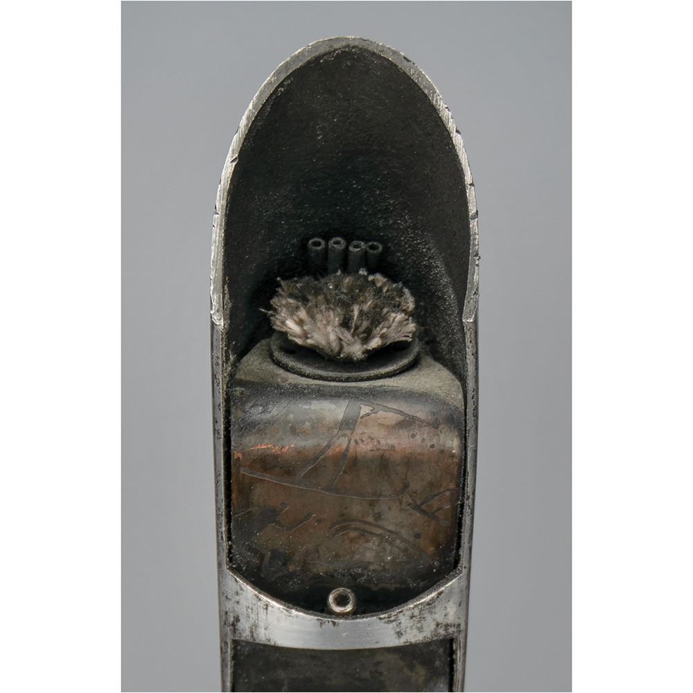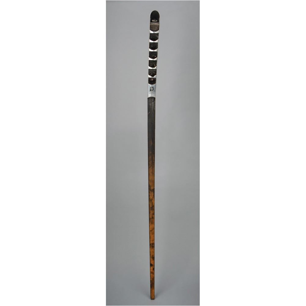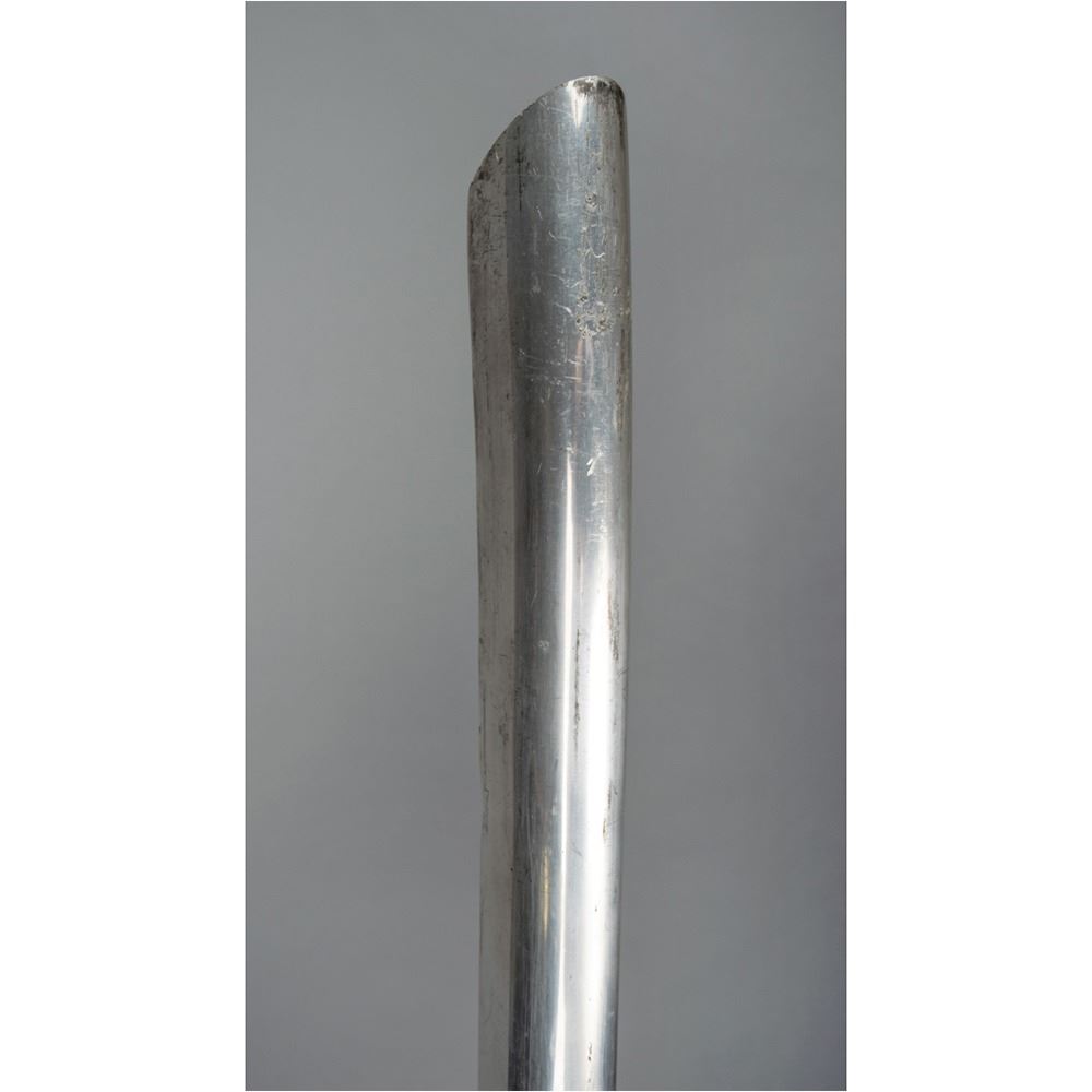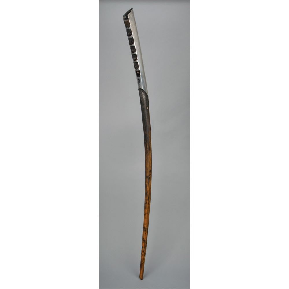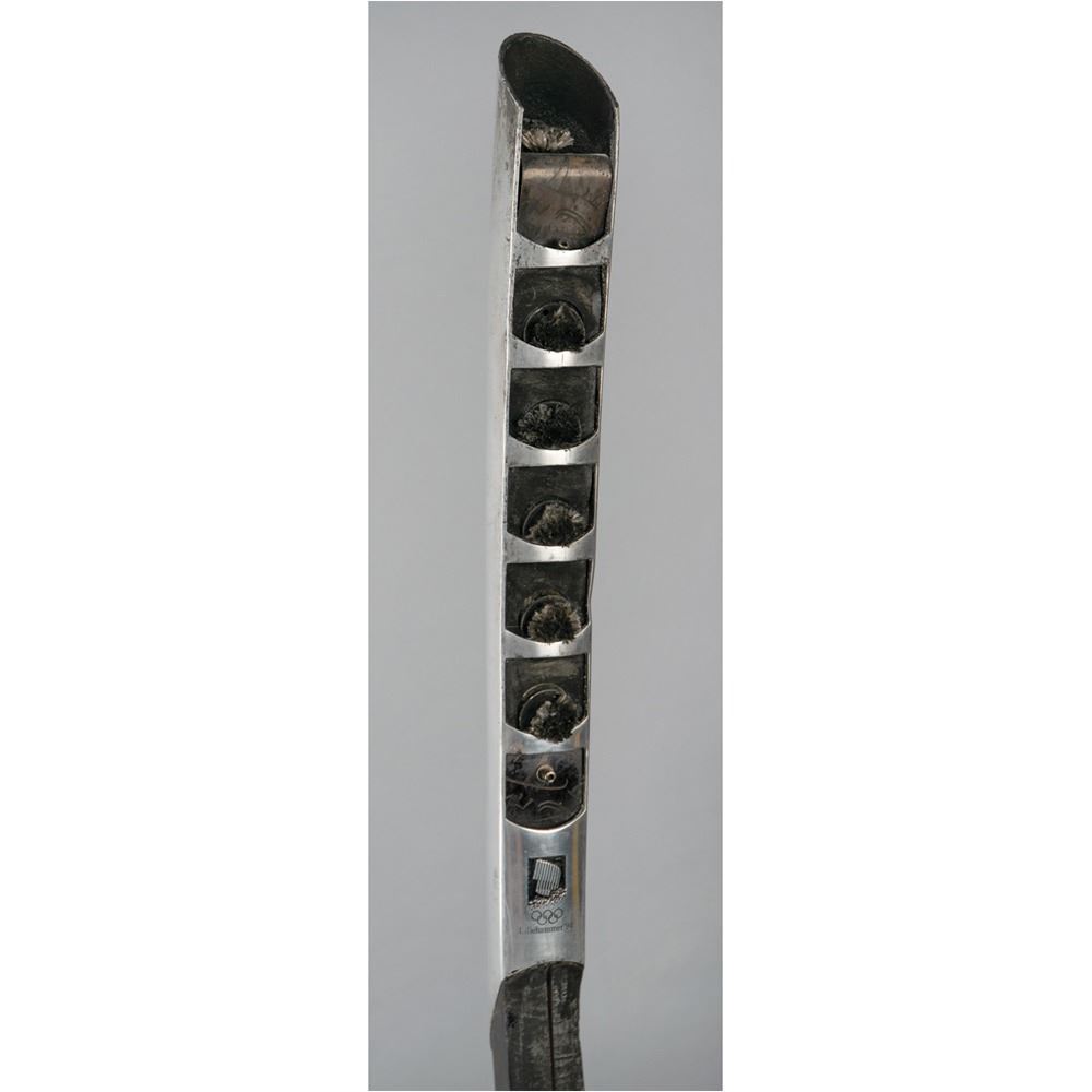 Magnificent official Lillehammer 1994 Winter Olympics torch, constructed of wood, iron, and copper, measuring an impressive 60Ë in length, designed by André Steenbuch Marandon and Paal Christian Kahrs, and manufactured by Paal J. Kahrs Arkitekter AS, Statoil. Resembling that of a sheath knife, the torch is highlighted by its long birchwood handle that symbolises Norway tradition, with the upper section consisting of a polished aluminium blade that conversely reflects the nation’s industrial modernity and technology. The base of the burner is engraved with the logo of the XVII Olympic Winter Games, and the upper and lower sections of the inner copper plate feature several event pictograms. In spite of its imposing, martial appearance, the supple elongated shape, coupled with its considerable length, were chosen with the view of forming a harmonious extension between the torch and its bearer—the creators of this torch bestowed it with the poetic name ‘Noble.’