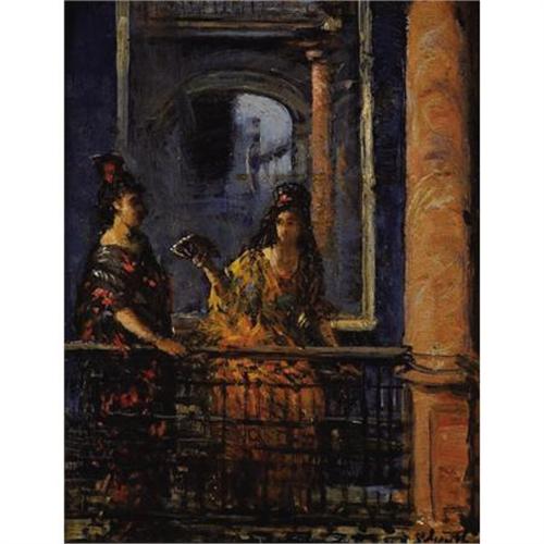 <B>LILLIAN MATHILD GENTH (American, 1876-1953)</B></I><BR><I>Spanish Women on Balcony</B></I><BR>Oil on artist's board<BR>10 x 9 inches (25.4 x 22.9 cm)<BR>Signed lower right: <I>L. Genth</B></I><BR> <B>Condition Report:</B> Excellent condition.<BR><BR><b>Shipping:</b> Framed - without Glass, Small (<a target="_blank" href="http://www.heritageauctions.com/common/shipping.php">view shipping information</a>)