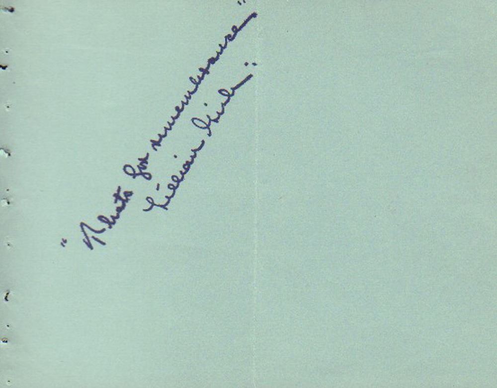 Autograph book page signed by Lillian Gish. The page had been folded in half at some point. All items come with a certificate of authenticity good for the life of the piece.