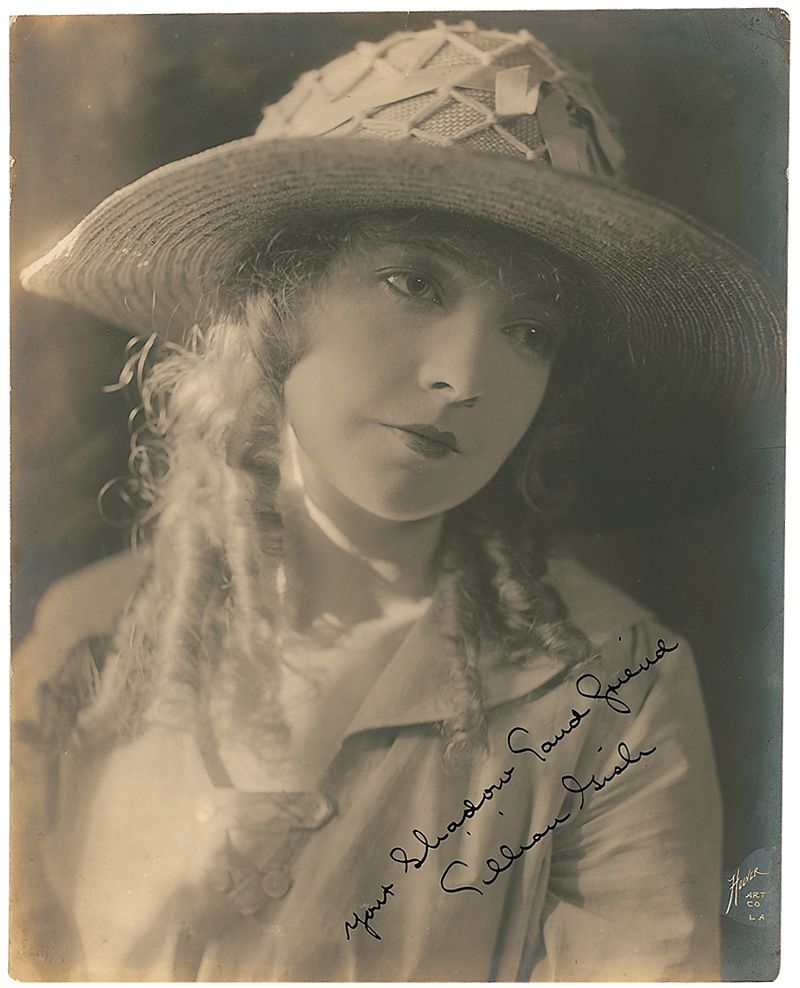 Vintage matte-finish 7.5 x 9.5 photo, signed in fountain pen, “Your Shadow Land friend, Lillian Gish.” Lightly trimmed edges, scattered silvering and dings to edges, and some light corner creases, otherwise fine condition.