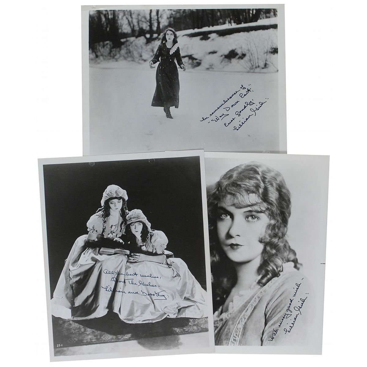 Three glossy photos of Gish, 8 x 10 and 10 x 8, each signed with a kind sentiment in black felt tip. In overall fine condition.