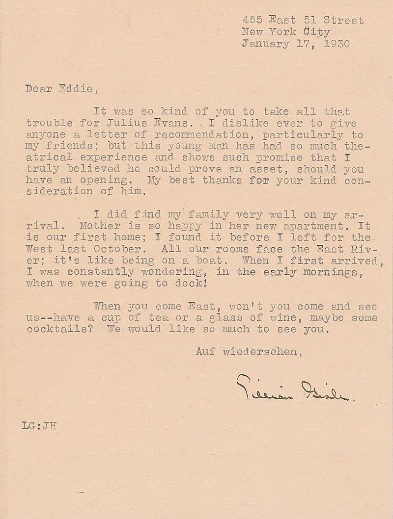 Early TLS, one page, 5.75 x 7.75, January 17, 1930. Letter to MGM executive Eddie Mannix. In part: “It was so kind of you to take all that trouble for Julius Evans. I dislike ever to give anyone a letter of recommendation, particularly to my friends; but this young man has had so much theatrical experience and shows such promise that I truly believed he could prove an asset.” In fine condition.