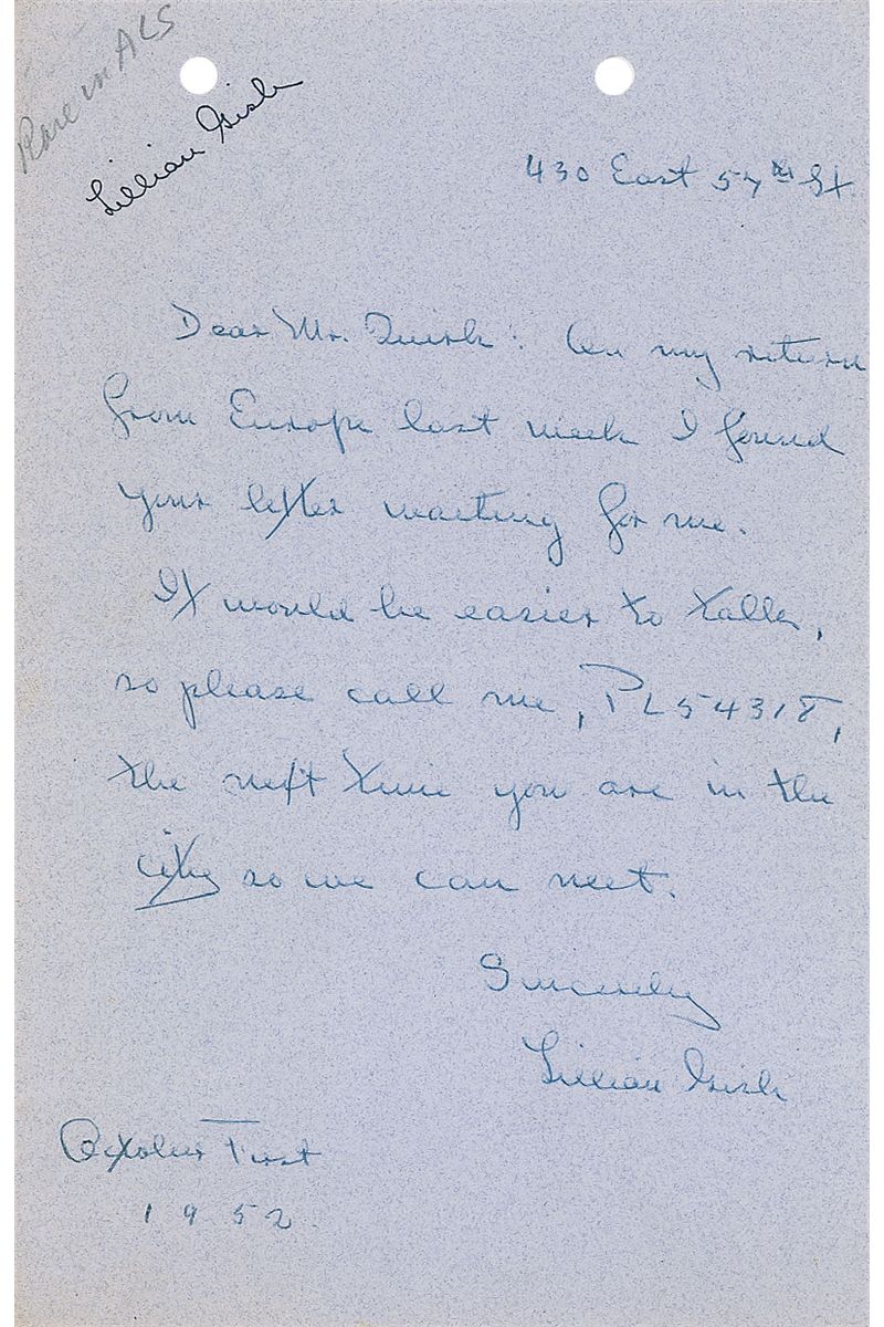 Scarce ALS, one page, 5.75 x 8.75, personal letterhead, October 1, 1952. Letter to Ms. Quirk. In part: “On my return from Europe last week I found your letter waiting for me. It would be easier to talk, so please call me.” In fine condition, with some mild edge toning, two punch holes to top edge, and pencil notation to upper left.
