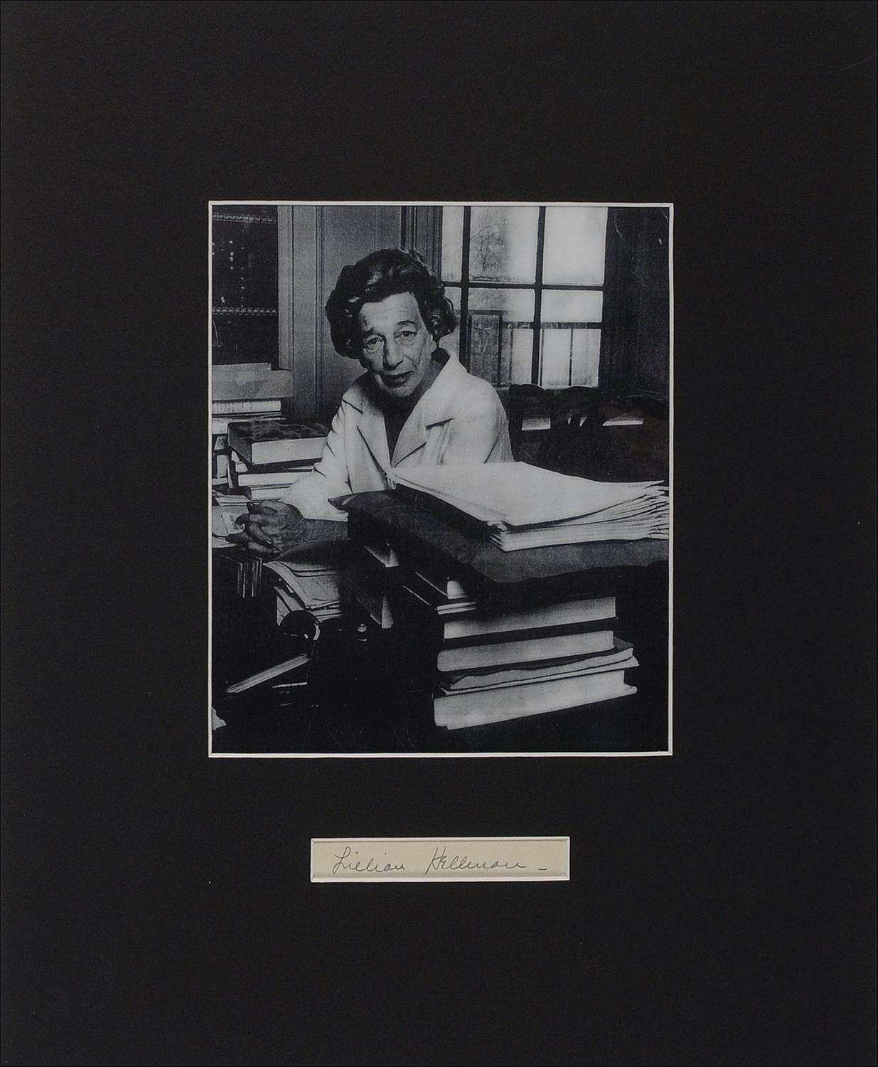 American playwright and screenwriter (1905–1984) best known for such classics as The Children’s Hour, The Little Foxes, and Watch on the Rhine. Ink signature, “Lillian Hellman,” on an off-white slip. Matted with a glossy photo of Hellman, to an overall size of 10.5 x 13. In fine condition, with a trivial brush to last name.