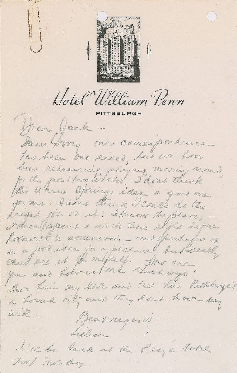 ALS in pencil, signed “Lillian,” one page, 6 x 9.25, Hotel William Penn letterhead, no date. Letter to Jack, in part: “I am sorry our correspondence has been one sided, but we have been rehearsing, playing, moving around, for the past two weeks. I don’t think the warm springs idea a good one for me. I don’t think I could do the right job on it. I know the place—I once spent a week there right before Roosevelt’s nomination—and perhaps it is a good idea for a picture, but I really can’t see it for myself.” In fine condition, with a light crease and rusty paperclip impression to the top.