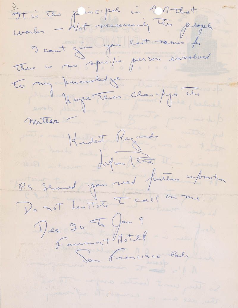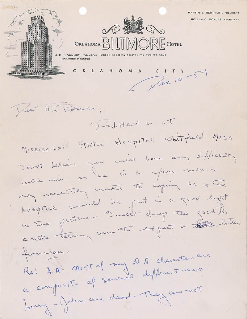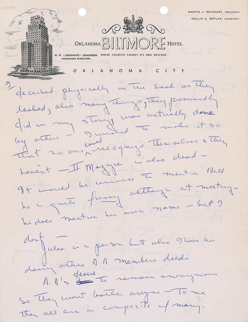 ALS, three pages on two sheets, 8.5 x 11, illustrated Oklahoma Biltmore Hotel letterhead, December 10, 1954. Letter to an admirer about her stories involving Alcoholics Anonymous. In part: “Most of my AA characters are a composite of several different ones…I wished to make it so that no one could recognize themselves & they haven’t…AAs desire to remain anonymous so they won’t bother anyone—to me they all are a composite of many. It is the principal [sic] in AA that works—not necessarily the people.” In fine condition, with staple holes and two punch holes to the top.