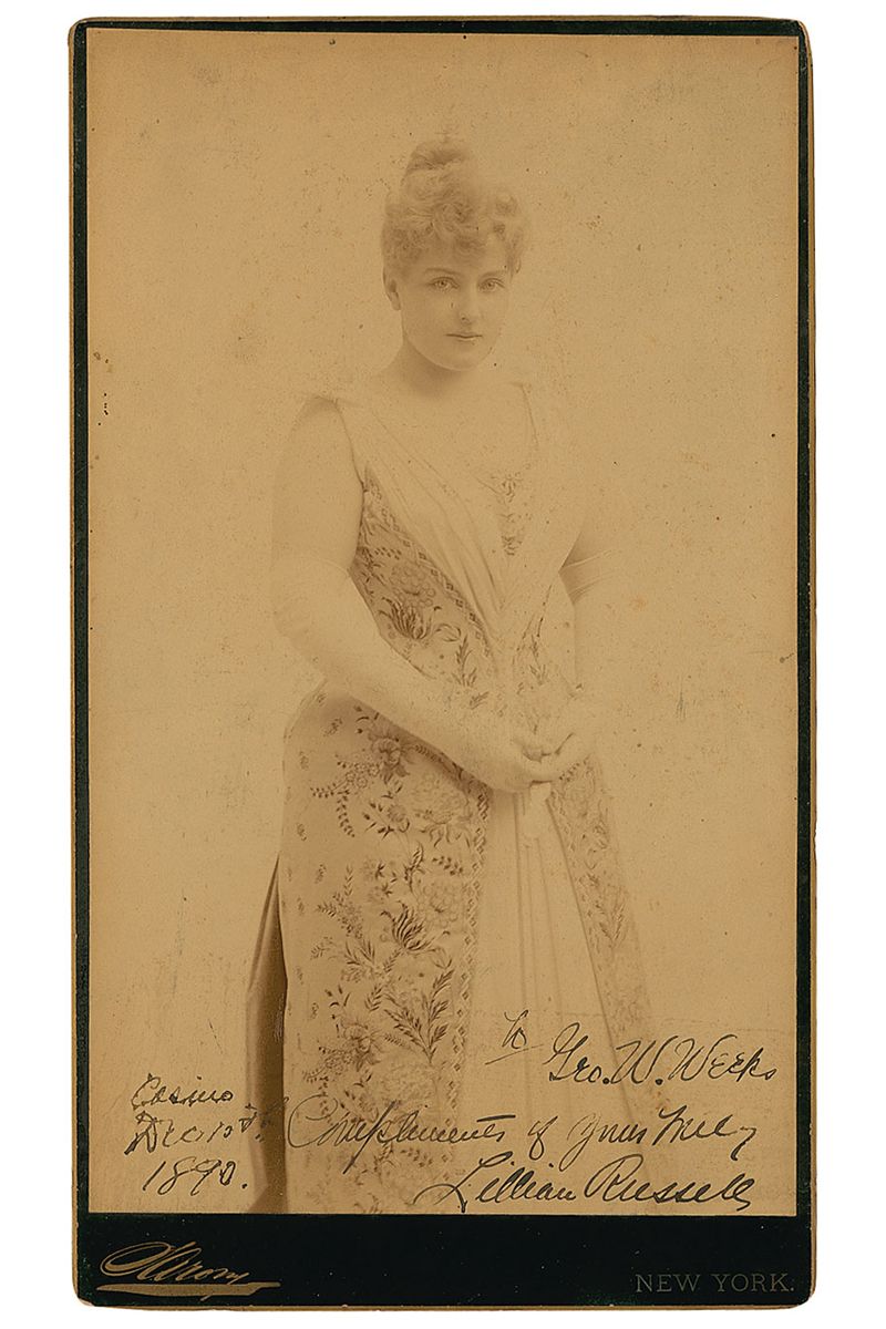 Original 7.5 x 13 cabinet-style three-quarter-length portrait of Russell in a floral dress, signed and inscribed at the bottom of the image in black ink, “To Geo. W. Weeks, Compliments of yours truly, Lillian Russell,” and dated December 15, 1890. Published by Sarony of New York. Image a bit faded and slight irregular ink adhesion, otherwise fine condition.