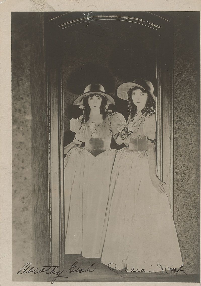 Vintage matte-finish 5 x 7 photo of the sisters posing in identical dresses, signed at the bottom in fountain pen by both. In fine condition, with a tack hole and fingerprint to the upper border.