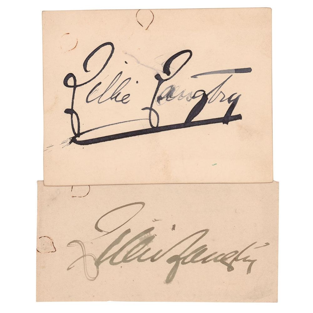 Two large ink signatures, "Lillie Langtry,†one on an off-white 4.75 x 2.25 slip, and the other on a 4.5 x 3.5 card. In fine condition, with rusty paperclip impressions to both.