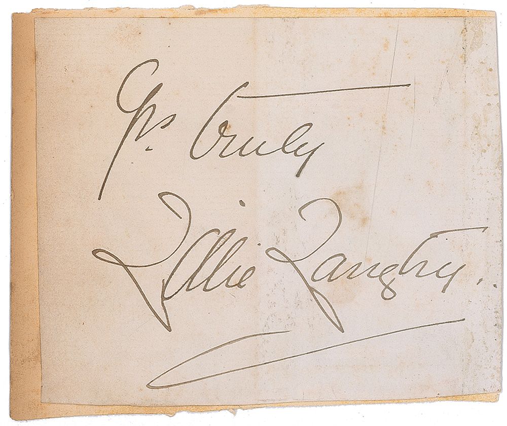 Vintage fountain pen signature, “Yrs truly, Lillie Langtry,” on an off-white 4.5 x 3.5 slip affixed to a slightly larger piece of heavy cardstock. In very good condition, with scattered toning and soiling, and some adhesive remnants to right edge.