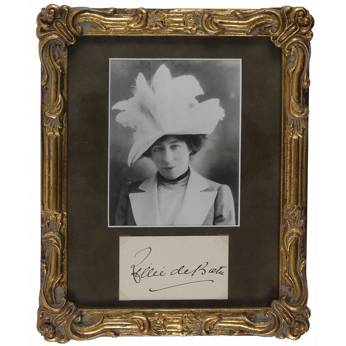 British actress (1853–1929) who also attained legend as a royal mistress, racehorse owner, maker and spender of fortunes, and natural beauty. Uncommon vintage ink signature, “Lillie de Bathe,” on an off-white 3.5 x 2.25 card. Framed with a portrait of Langtry to an overall size of 9.25 x 11. In fine condition, with a couple light pencil remnants to corners. For more detailed biographical information on Langtry please click here.