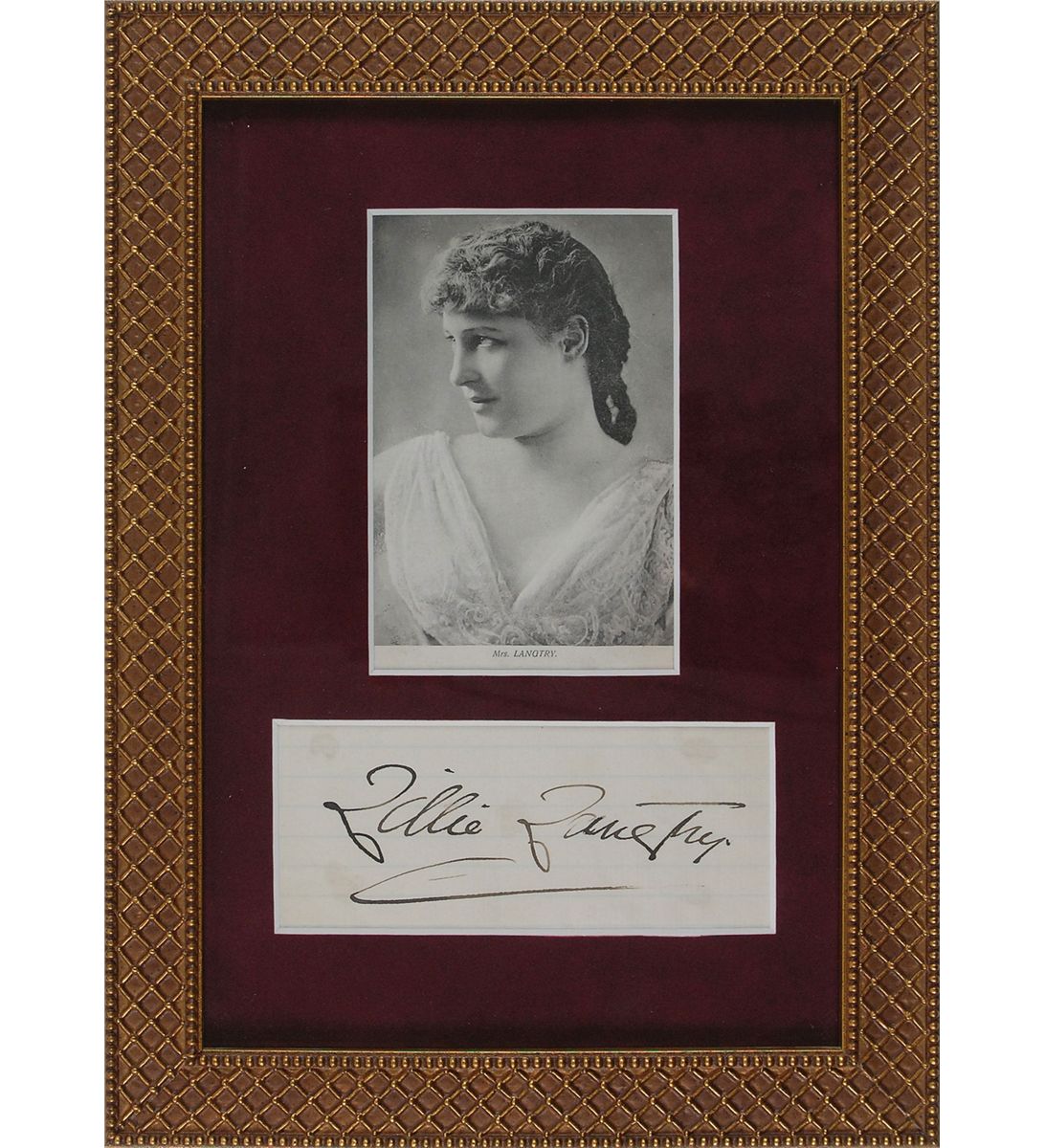 British actress (1853–1929) who also attained legend as a royal mistress, racehorse owner, maker and spender of fortunes, and natural beauty. Large vintage fountain pen signature, “Lillie Langtry,” on an off-white 5.5 x 2.75 lightly-lined slip. Suede-matted and framed with a postcard photo to an overall size of 9.5 x 13. In fine condition, with a few spots of toning from adhesive on reverse. For more detailed biographical information on Langtry please click here.
