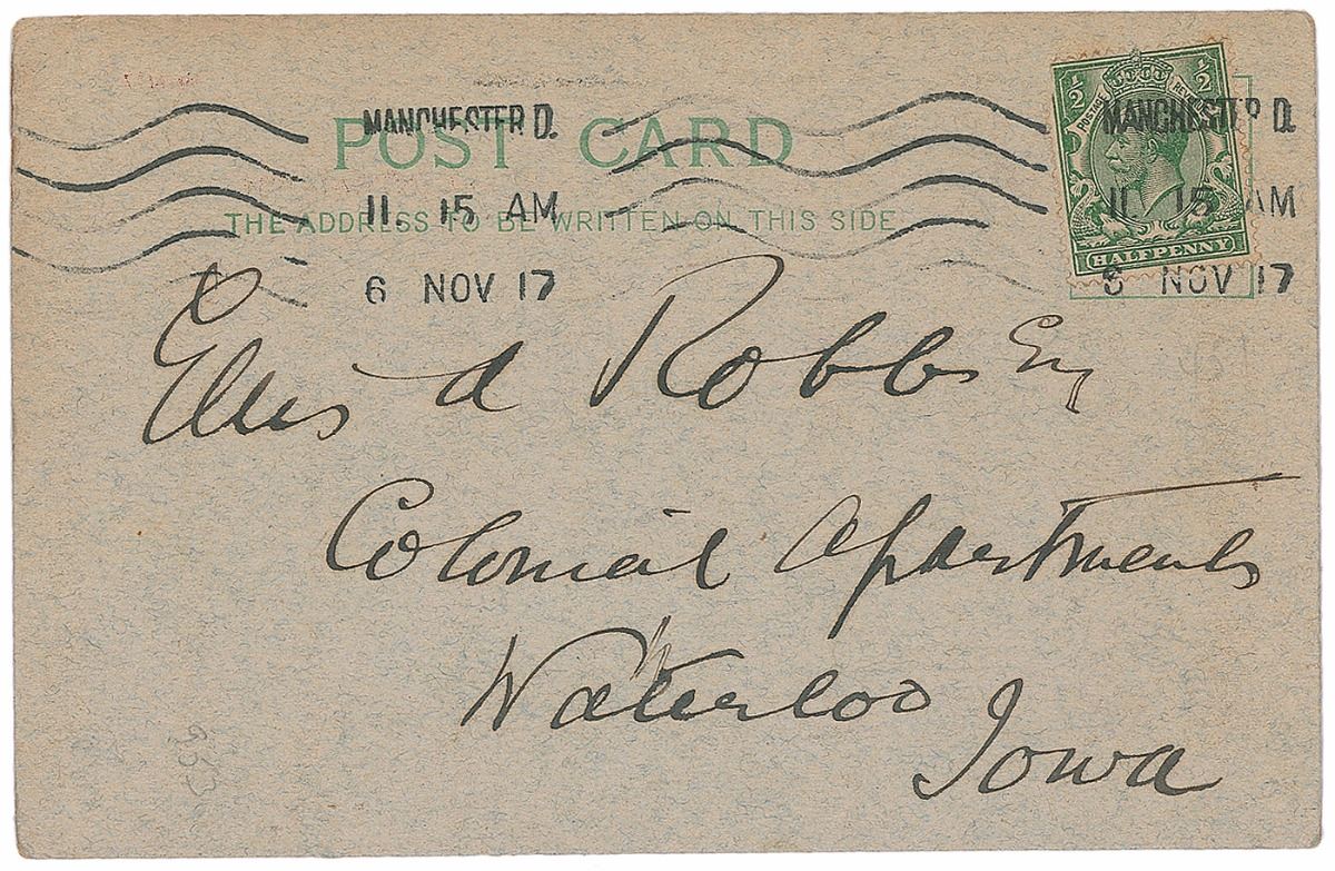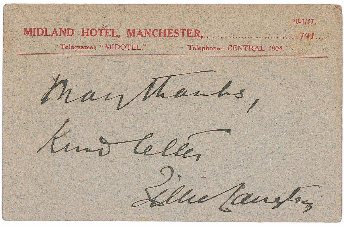 Ink signature, “Many thanks, kind letter, Lillie Langtry,” on an off-white 5.5 x 3.5 postcard from the Midland Hotel in Manchester, postmarked November 6, 1917. Irregular ink adhesion and trivial brushing to portions of the inscription and signature, and slight toning and wear to edges, otherwise fine condition.