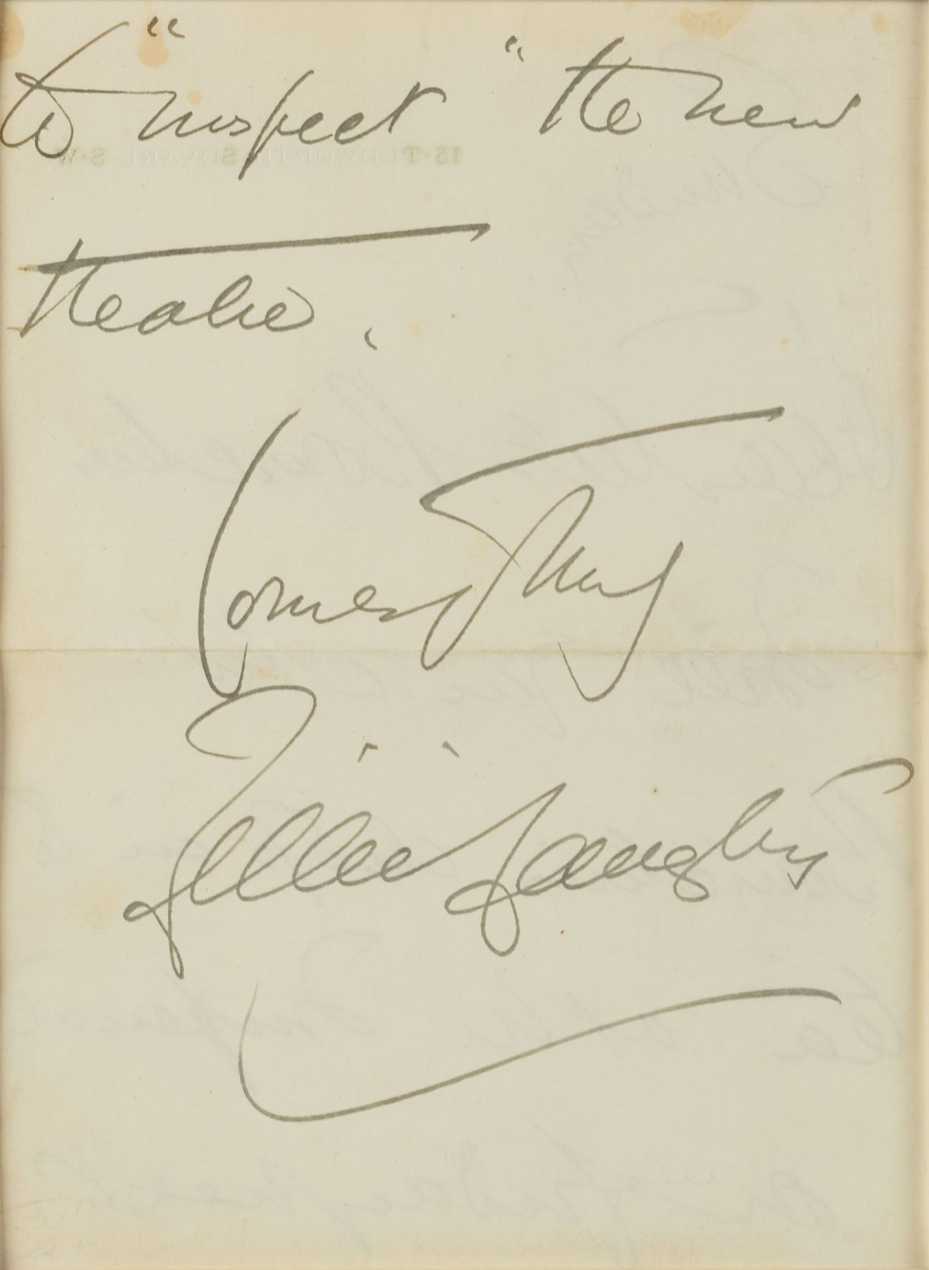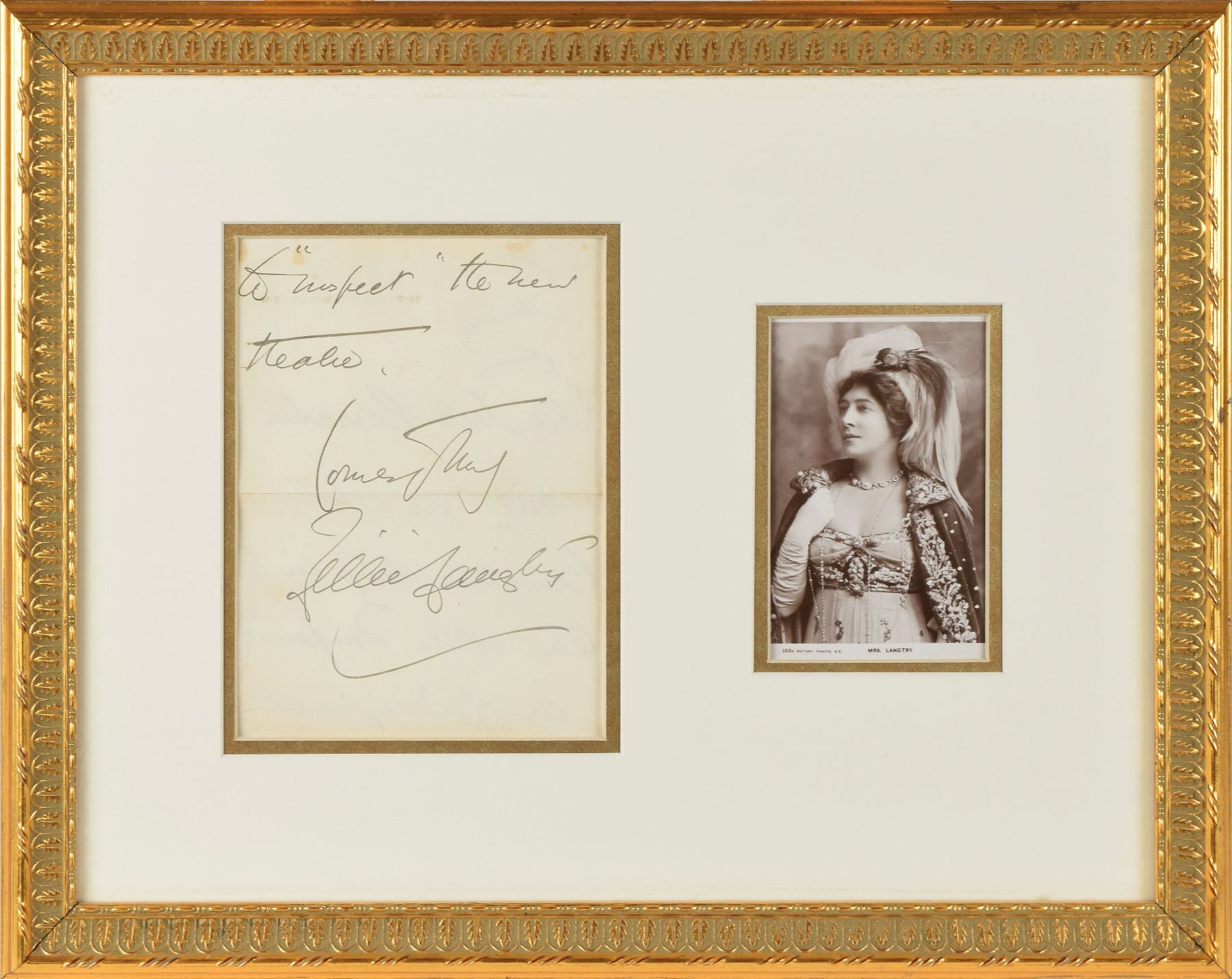 ALS, one page both sides, 5.5 x 7.5, no date. The letter has been framed to only show the signed side, and reads, in part: "…to 'respect' the new theatre. Yours truly, Lillie Langtry." Double-matted and framed with a photo of Langtry to an overall size of 18.5 x 14.75. In fine condition, with light stains to the top edge.