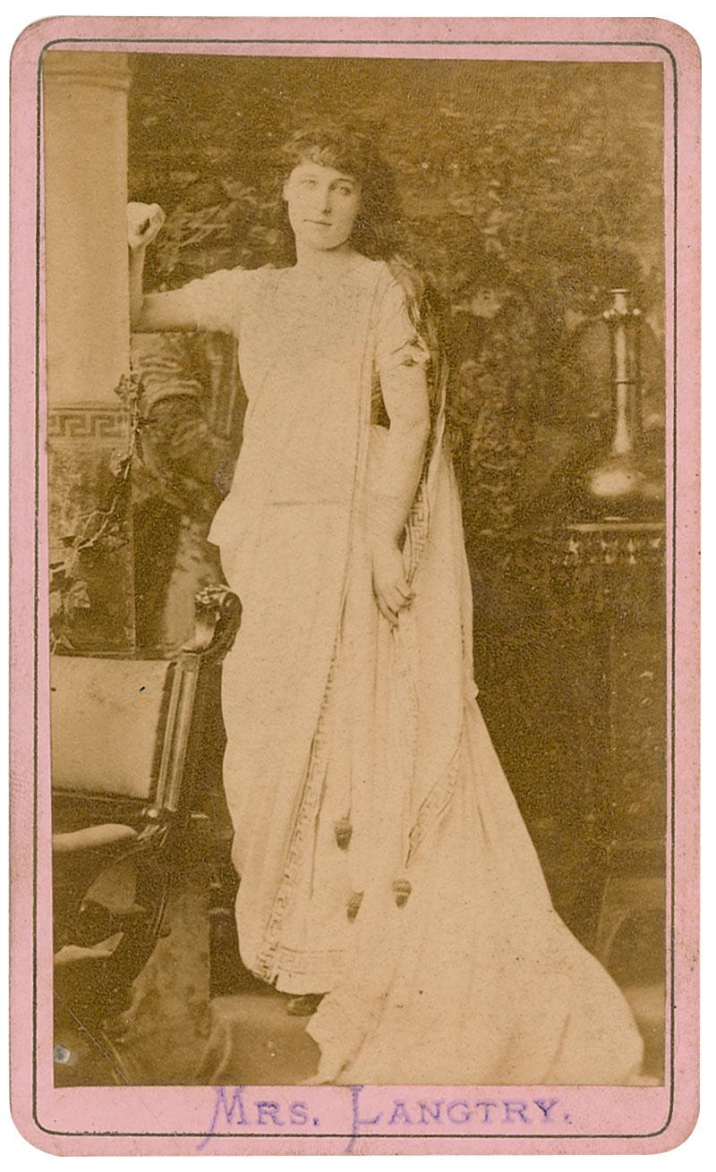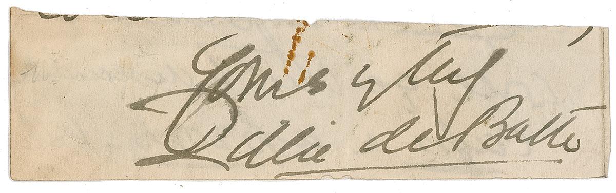 British actress (1853–1929) who also attained legend as a royal mistress, racehorse owner, maker and spender of fortunes, and natural beauty. Ink signature, “Yours truly, Lillie de Bathe,” on an off-white 5 x 1.5 slip clipped from a larger letter. In very good condition, with rusty paperclip mark to top edge, show-through from writing and mounting remnants on reverse, and some scattered light soiling and wrinkling. Accompanied by an original unsigned full-length carte-de-visite portrait. An uncommon autograph, signed after her marriage in 1899 to the much younger, Hugo Gerald de Bathe.