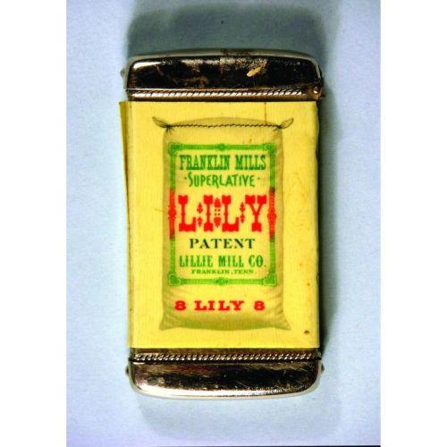 Lillie Mill Company Celluloid Match Safe, advertising Lilly Flour, Franklin, TN. Excellent condition. 1 1/2 X 2 3/4 inches.