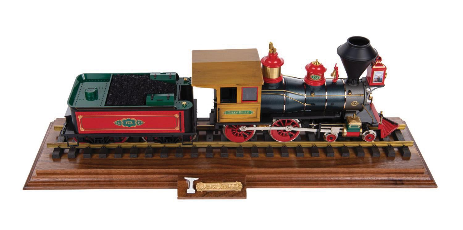 (Disneyland, 2000) A limited edition G-Scale model of Walt Disney's Lilly Belle locomotive train and tender from his Carolwood Pacific Railroad, manufactured by Hartland Locomotive Works. Created in an edition of 1,500 to commemorate the 50th anniversary of Walt's backyard railroad, the train is presented on a wooden display base with mounted 2-foot section of G-scale track, and acrylic case. The Lilly Belle and tender measure a combined 22" long while the base is 26.25"x2" and 7.25" deep. The miniature hand-crafted plaque exhibits loose parts. Otherwise, the piece displays in very fine condition. The original packaging exhibits moderate wear throughout with some creasing and surface wear and spots of tacky adhesive. The plexiglass display box has some adhesive wear from tape.